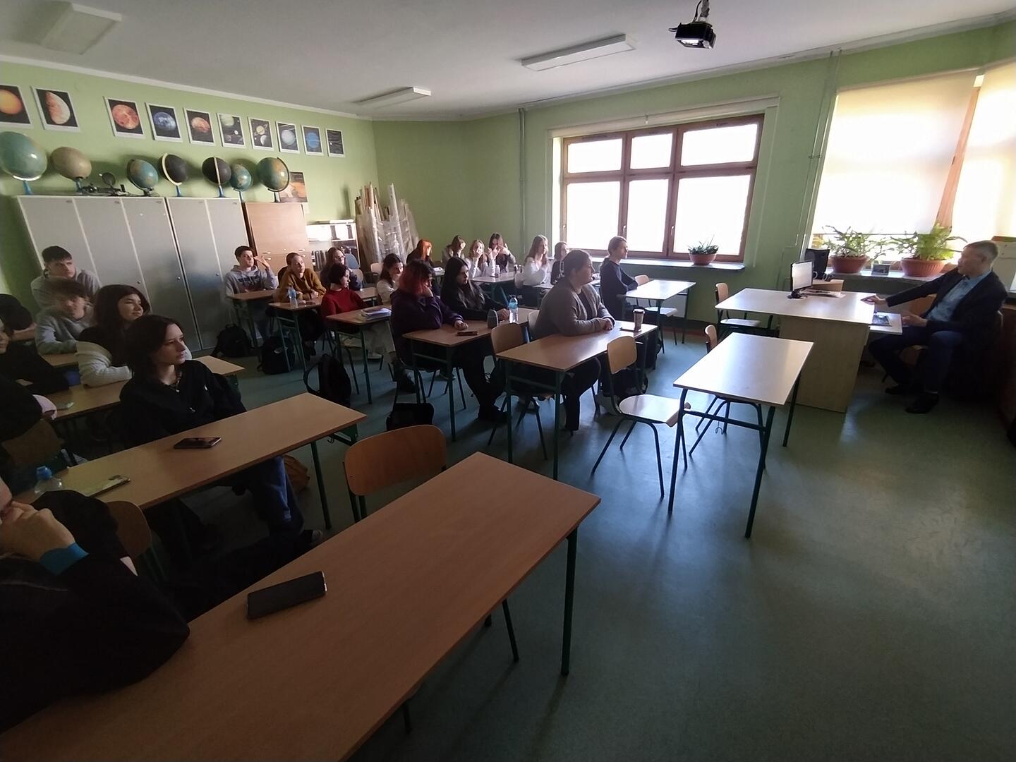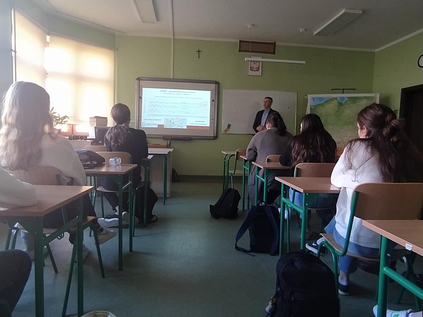 Na początku wykładu dowiedzieliśmy się o tym, że nasza szkoła posiada stację meteorologiczną w systemie monitoringu aglomeracji trójmiejskiej. Wykład był poświęcony zmianom klimatu i ekstremalnym zjawiskom pogodowym. Pan Szpakowski pokazał jak ważne są działania mieszkańców do adaptacji i mitygacji zmian klimatu.