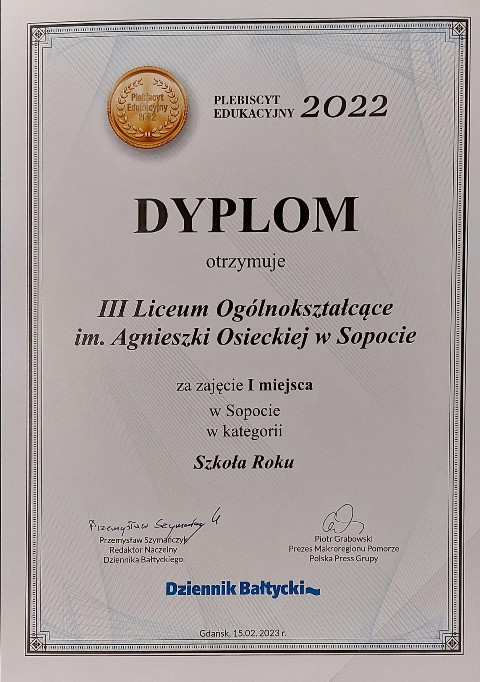 3LO w Sopocie Szkołą Roku w Sopocie w Plebiscycie Edukacyjnym 2022 Dziennika Bałtyckiego