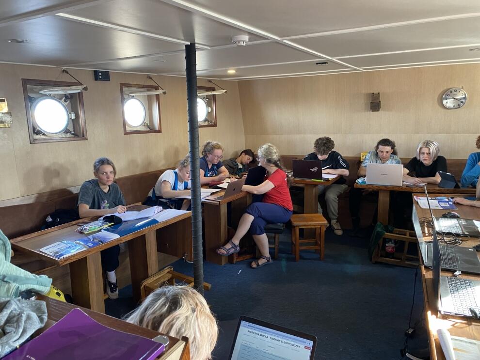 Adela oprócz fascynującej przygody życia łączy regularną naukę według programu szkolnego z żeglugą dalekomorską.