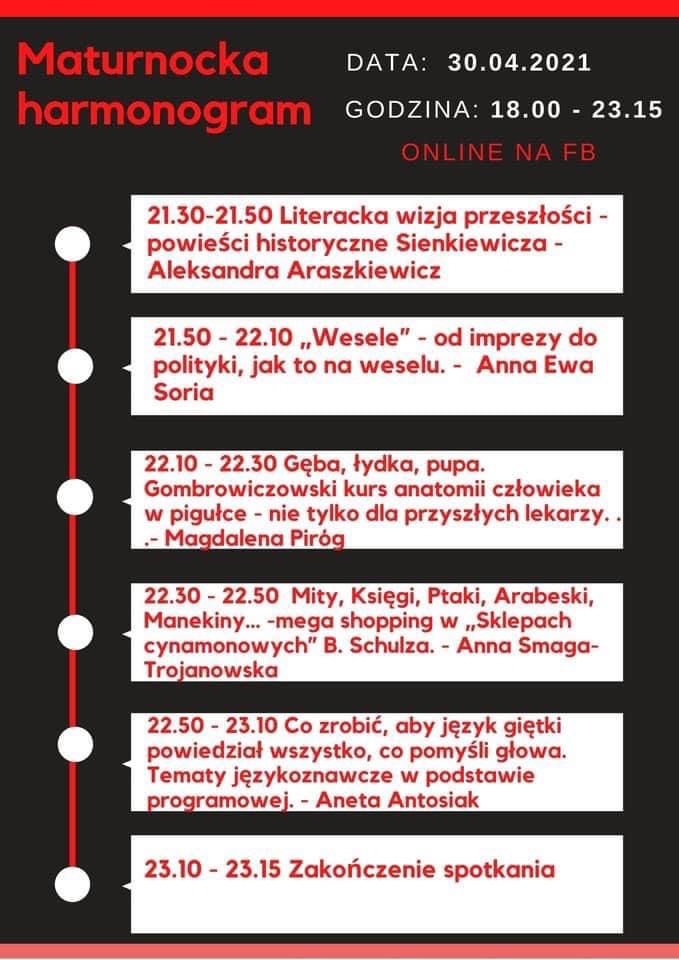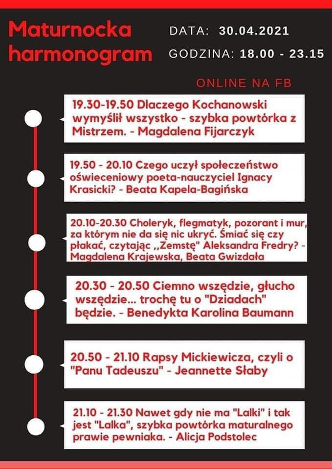 Zapraszamy wszystkich Maturzystów do uczestniczenia w unikatowym wydarzeniu online, które odbędzie się 30 kwietnia 2021 : I Ogólnpolska Maturnocka Online.  Jest to swoiste utrwalenie materiału przed egzaminem maturalnym z języka polskiego przez najlepszych polonistów w Polsce. Ponad to jedną z prelegentów Nbędzie nasz nauczyciel : Pani Beata Kapela Bagińska