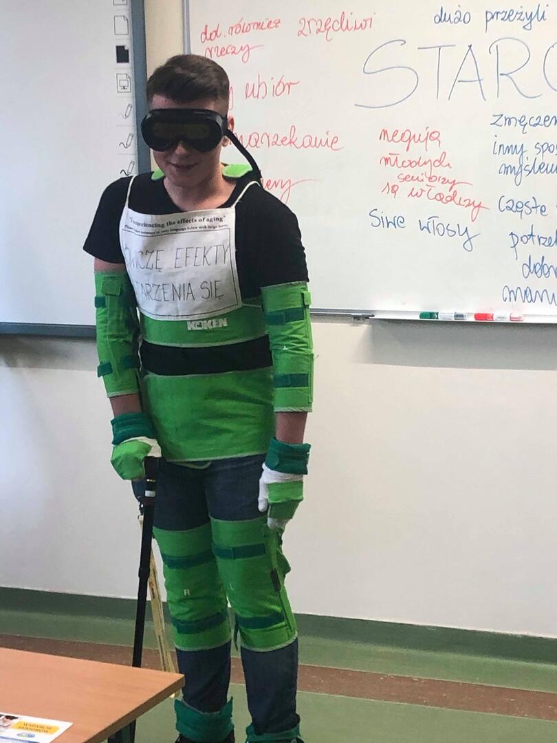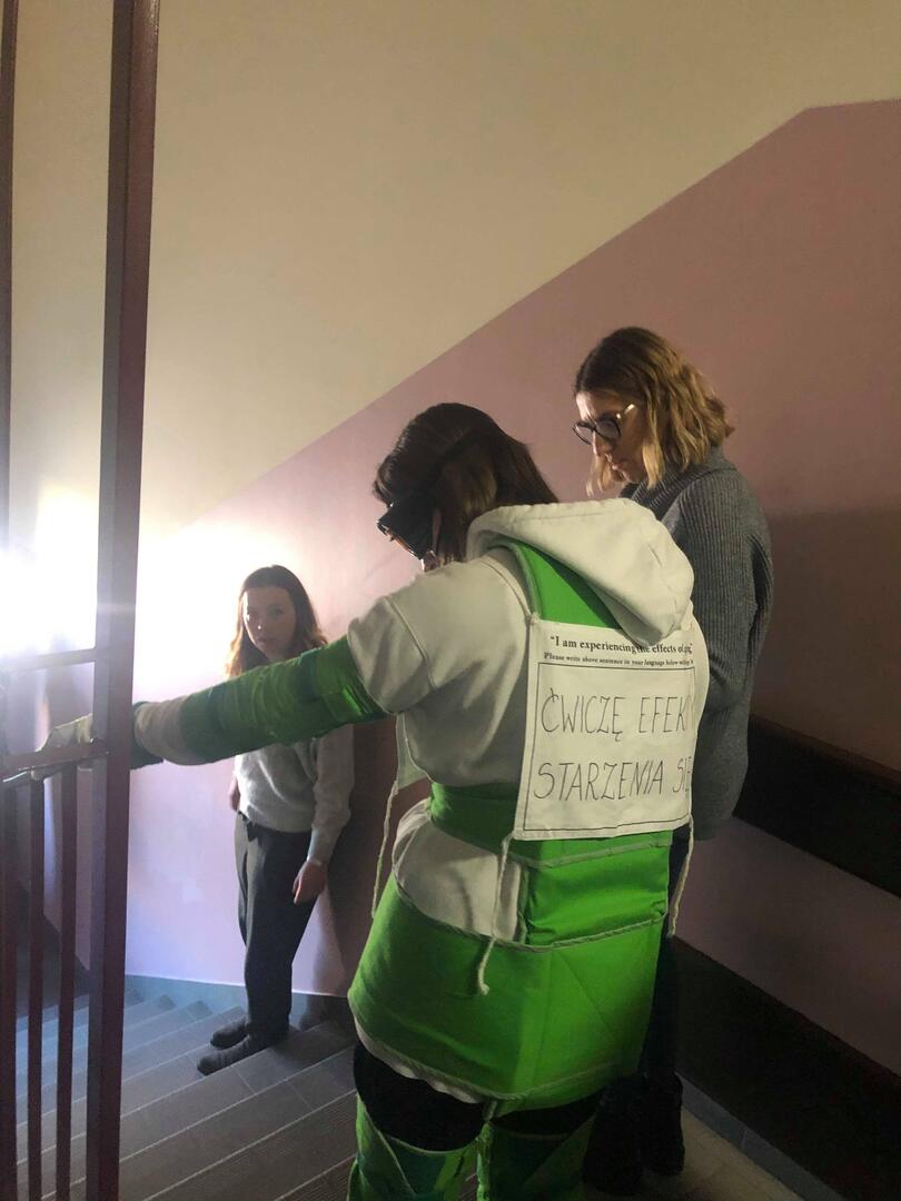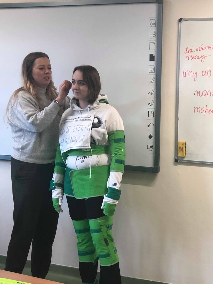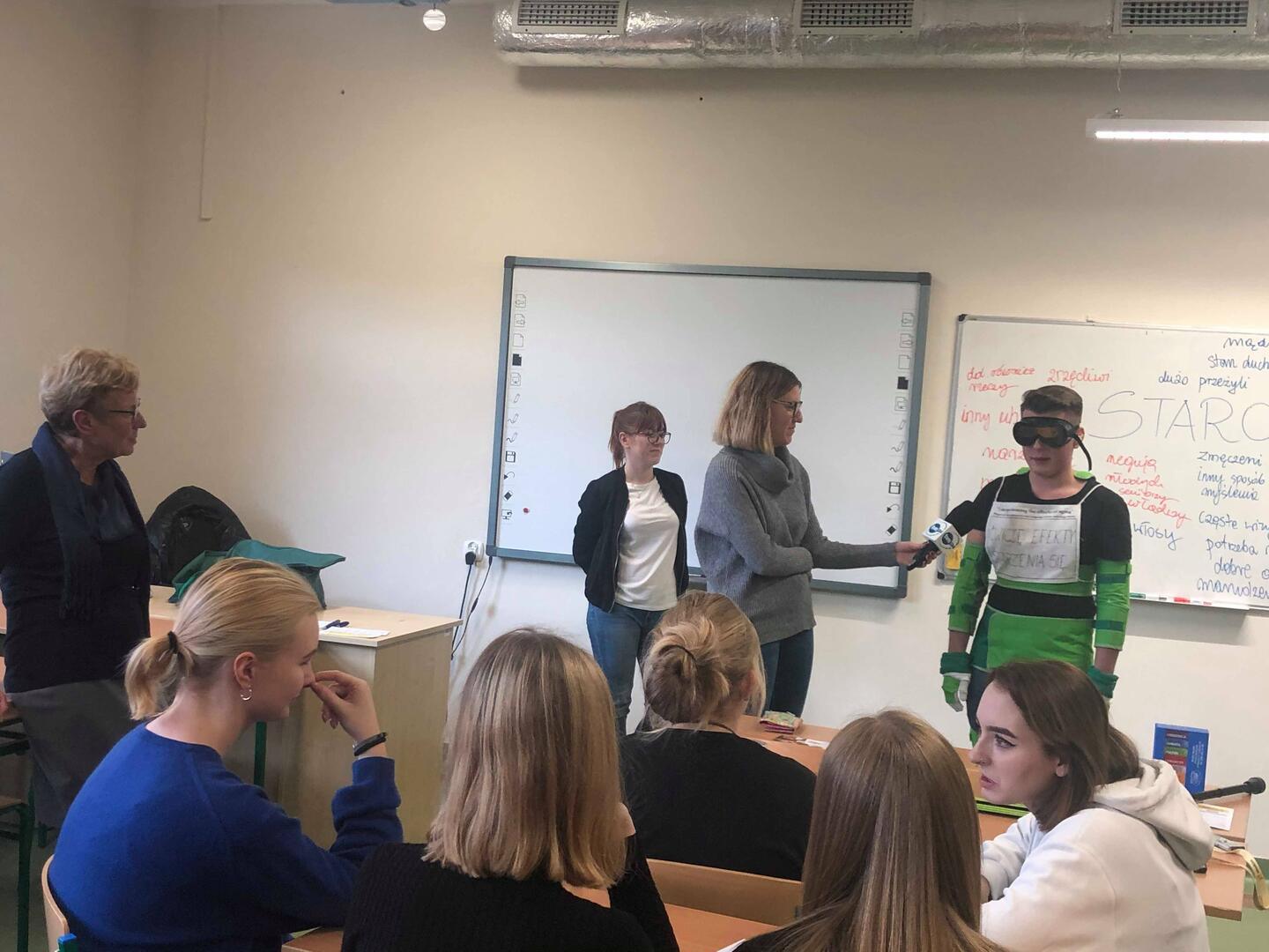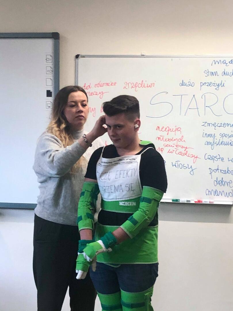 Dziś w klasach pierwszych odbyły się warsztaty: Bliżej starości przygotowane przez Miejski Osrodek Pomocy Społecznej. Uczniowie dzieki „symulatorowi starości” mogli poczuć, czym jest starość i jakie trudności musza pokonywać każdego dnia ludzie starsi, wykonując codzienne czynności. Było refleksyjnie. W warsztatach klasie 1 AP towarzyszyły kamery TVN 24