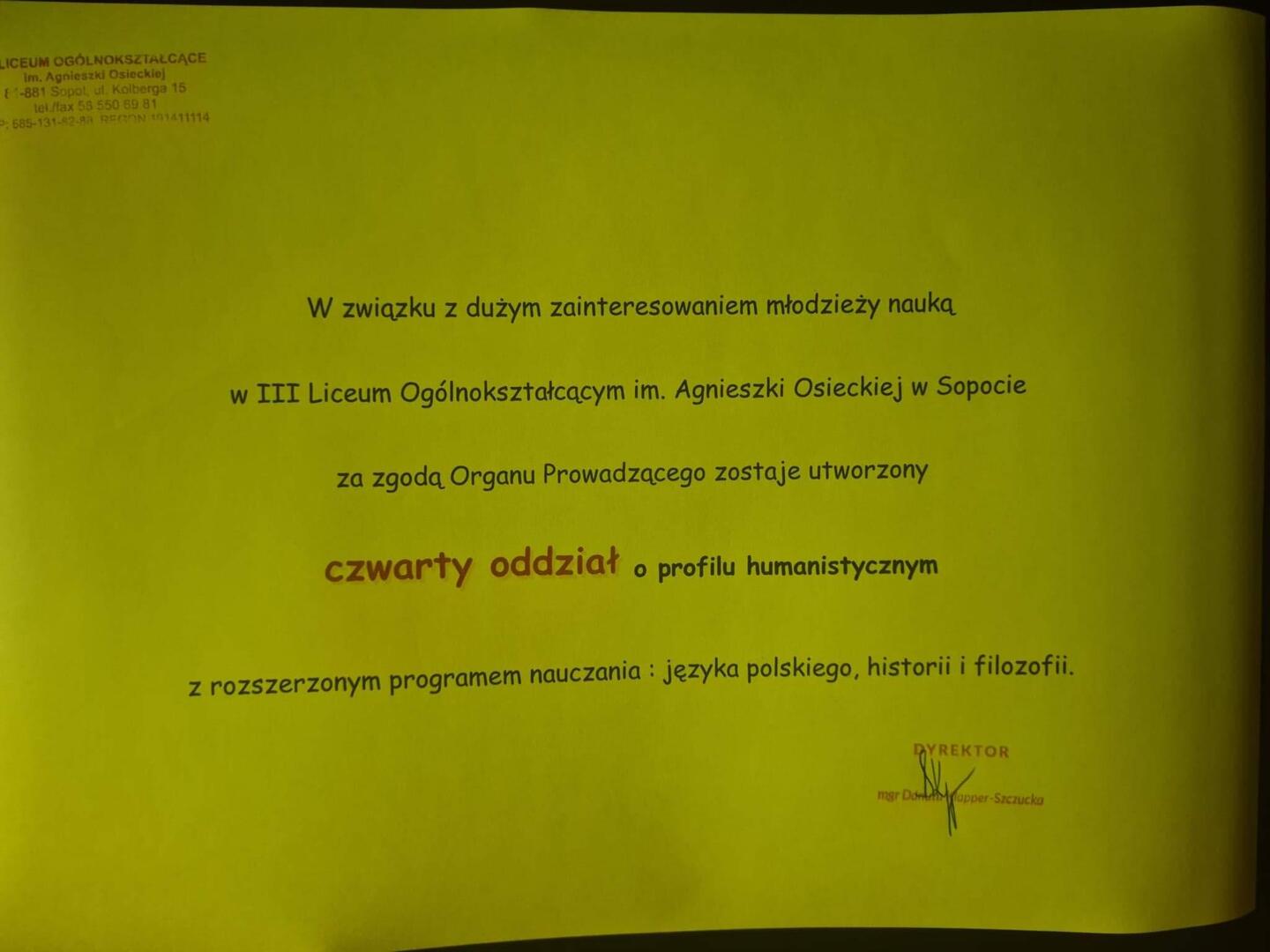 Ze względu na bardzo duże zainteresowanie nauką w 3 LO im.Agnieszki Osieckiej w Sopocie, za zgodą Organu Prowadzącego, zostaje utworzony CZWARTY ODDZIAŁ  o profilu HUMANISTYCZNYM  z rozszerzonym programem nauczania: języka polskiego, historii oraz filozofii.
