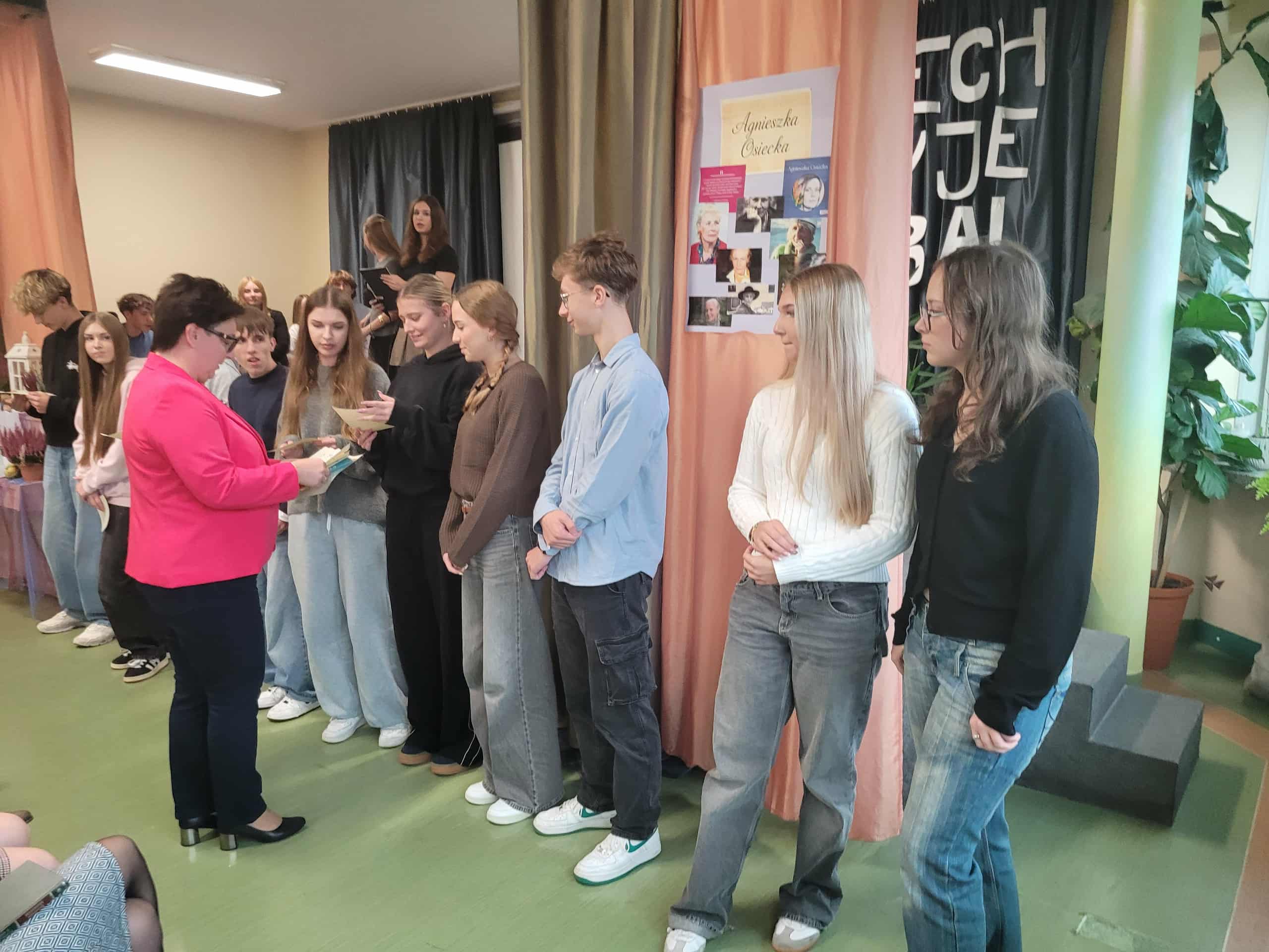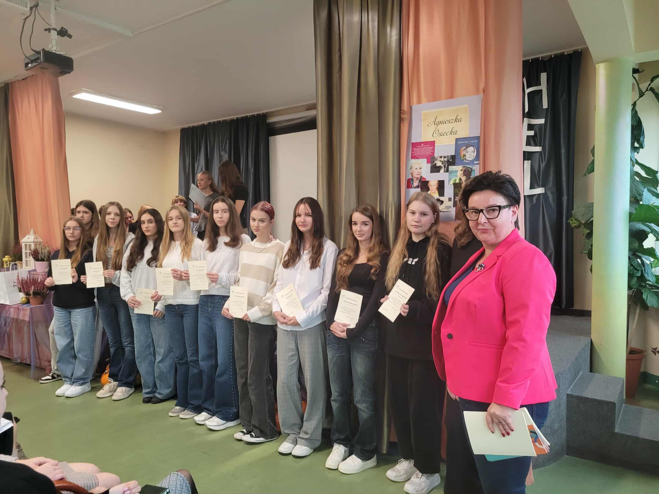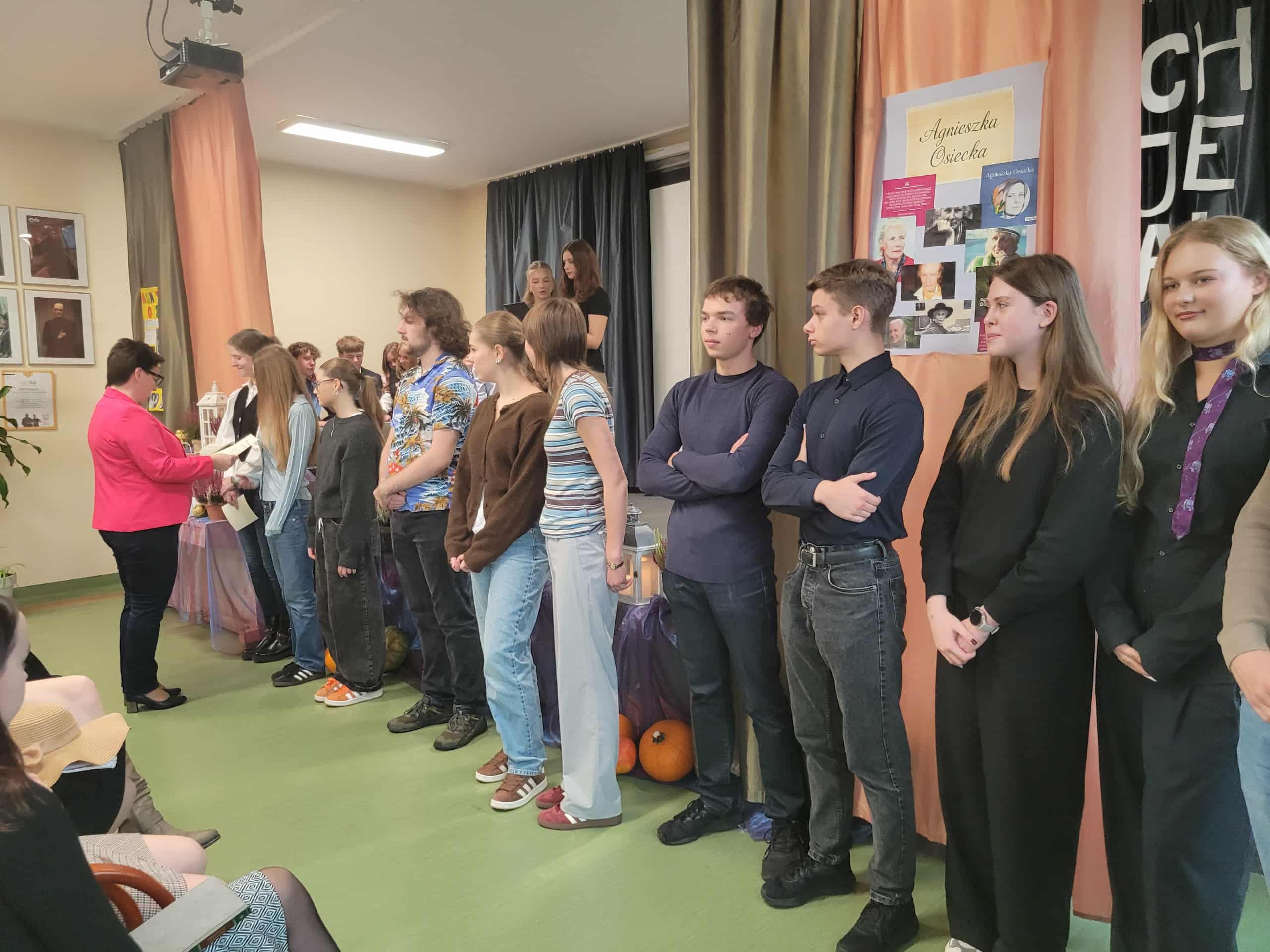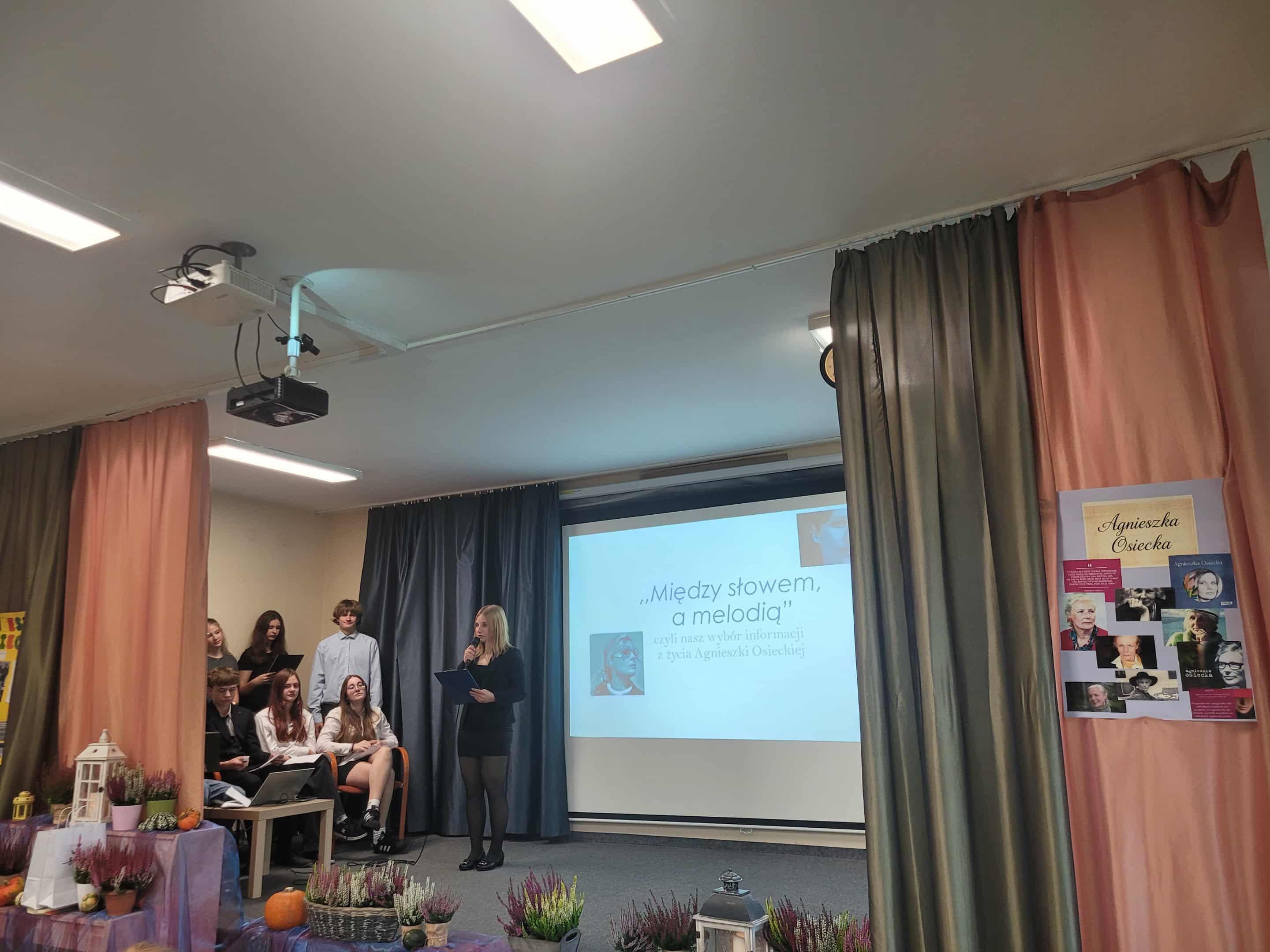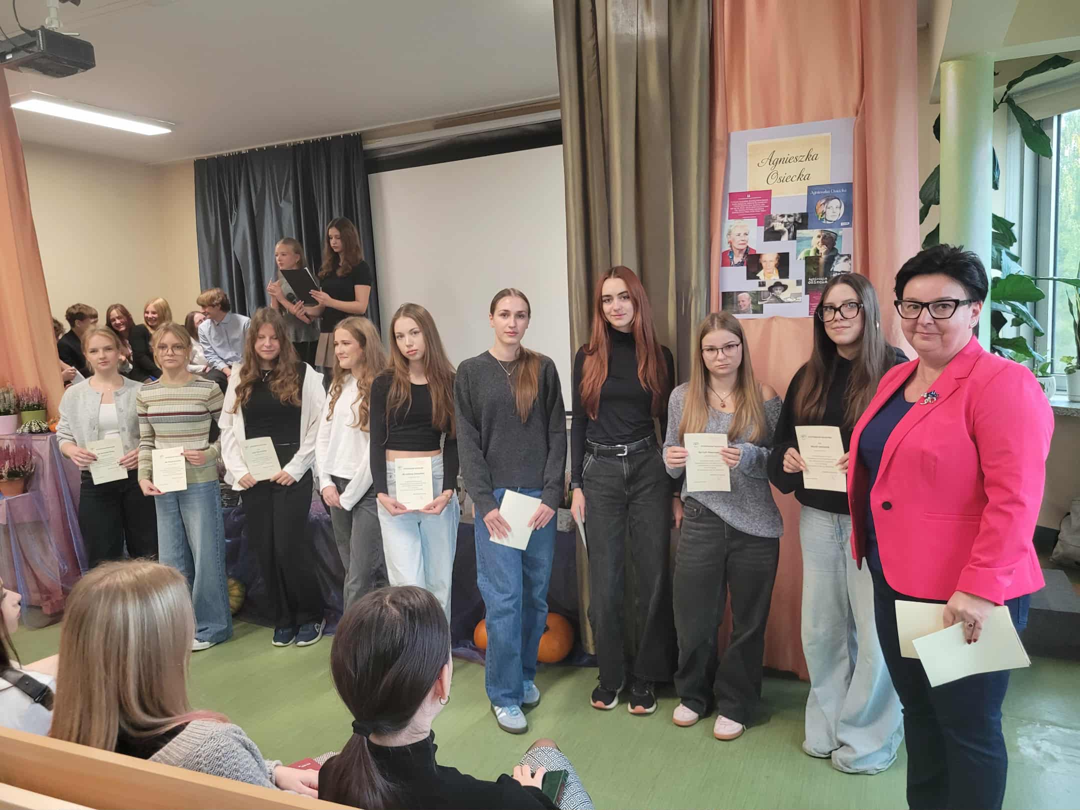 7 października 2025 roku odbył się uroczysty apel z okazji Dnia Patronki naszej Szkoły. Klasy pierwsze zaangażowały się w organizację tego ważnego wydarzenia: była prezentacja biografii Agnieszki Osieckiej, recytowano najpopularniejsze Jej wiersze i zaprezentowano pokaz mody przy dźwiękach znanej muzyki ze słowami poezji autorki. Na koniec Pani Dyrektor uhonorowała nagrodą wybitnych stypendystów naszej szkoły w kategoriach: frekwencja, wyniki naukowe oraz sportowe.