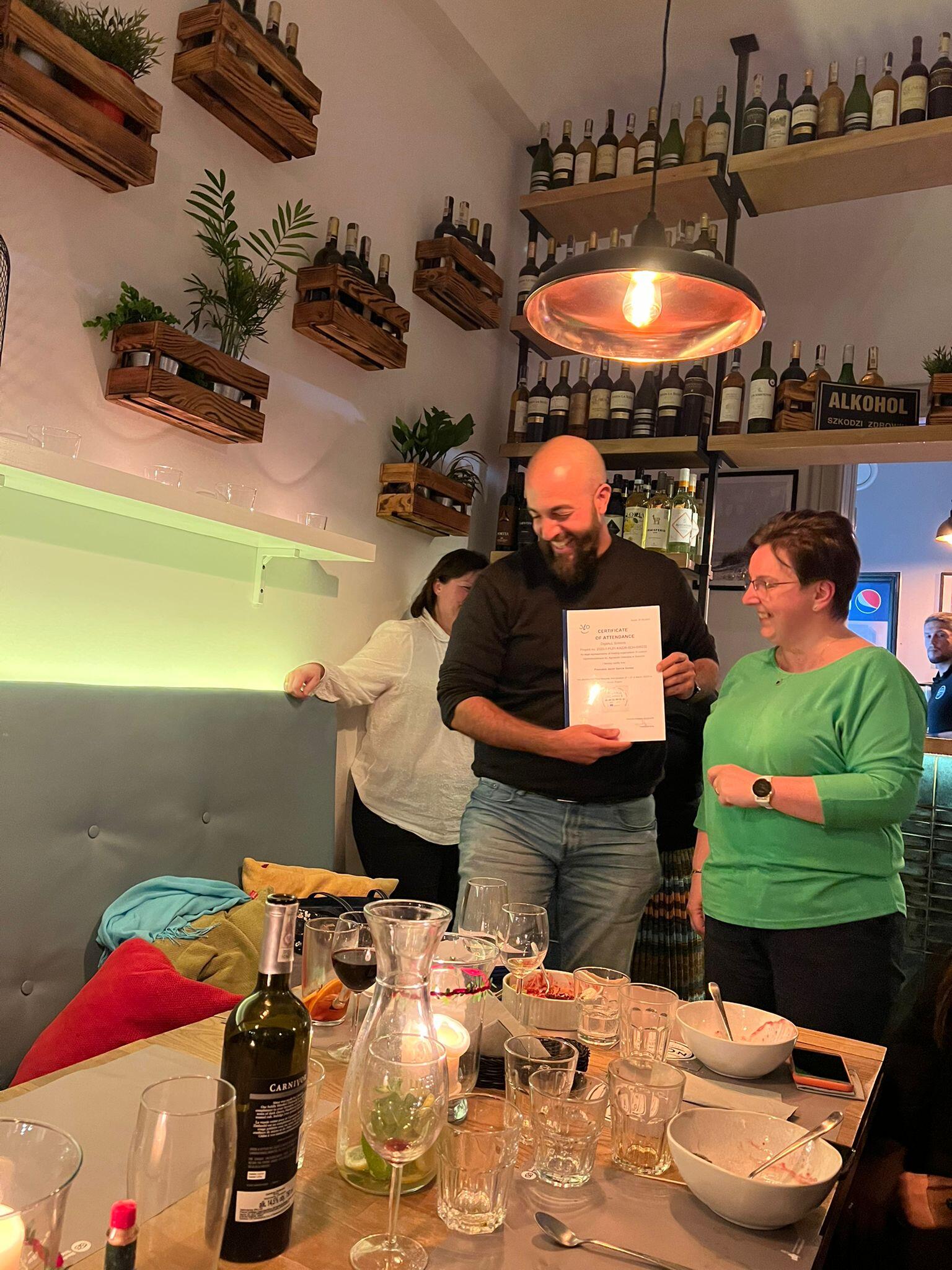 Piątek to ostatni dzień naszej wspólnej pracy. Nadszedł czas pożegnania i jednocześnie przygotowania do opracowania raportu podsumowującego projekt. Podczas kolacji pożegnalnej Pani Dyrektor wręczyła gościom certyfikaty uczestnictwa w tygodniowym spotkaniu. To był bardzo intensywny i owocny czas dla wszystkich. Dziękujemy naszym gościom za wizytę i efektywną pracę, a całej społeczności szkolnej za gościnność i pomoc.