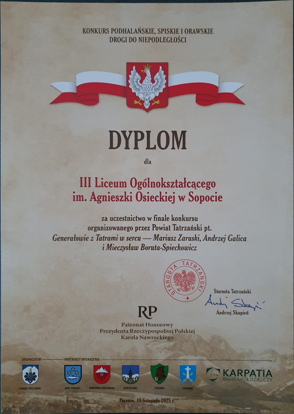 10 listopada 2025 r. uczniowie naszej szkoły, tj. Mateusz Kasprzak, Franciszek Sałek i Stanisław Wróblewski z klasy III D, pod opieką p. Justyny Wójcikiewicz wzięli udział w Finale Konkursu: "Podhalańskie, spiskie i orawskie drogi do niepodległości".