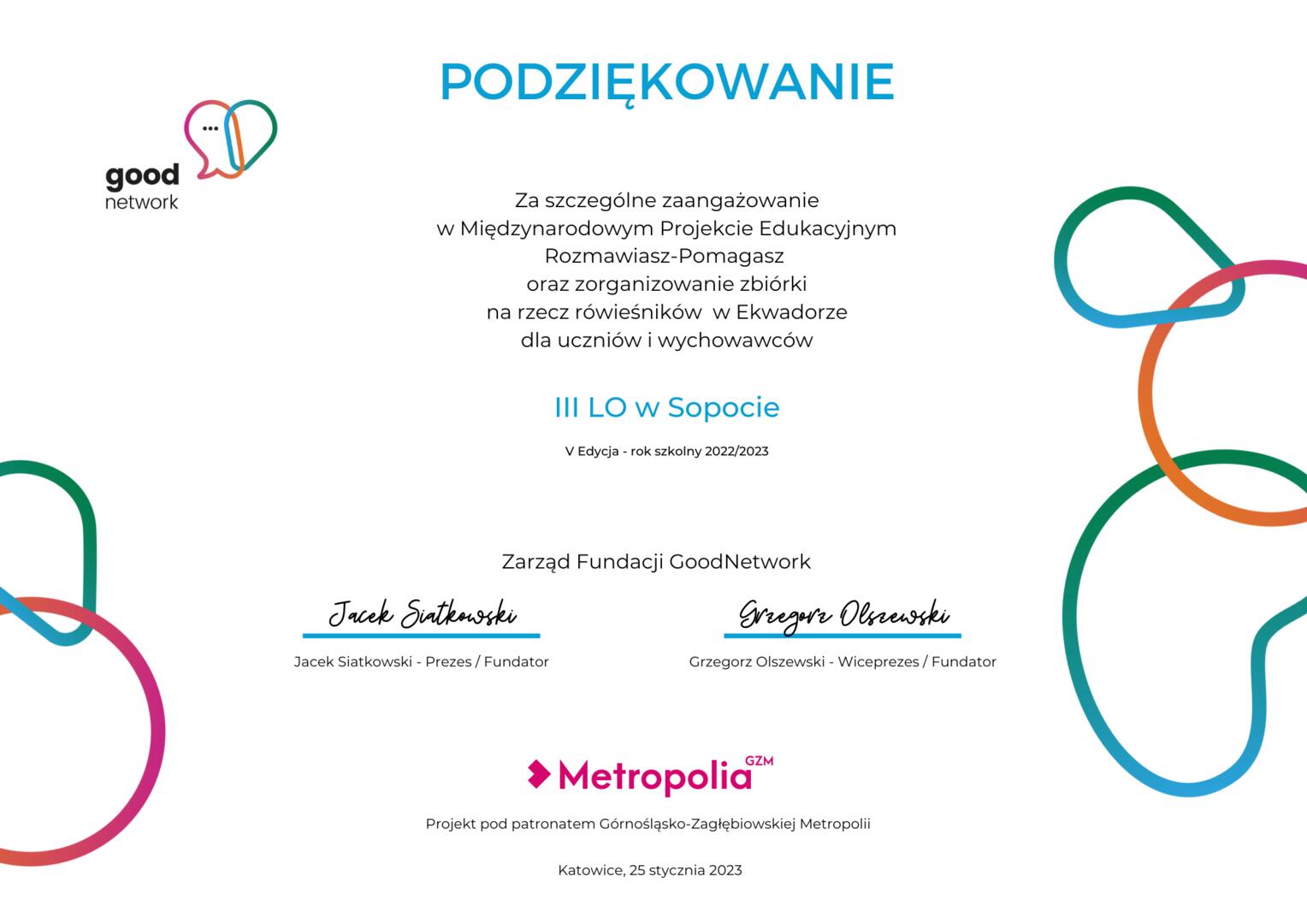 Zaangażowanie uczniów naszej szkoły uczących się języka hiszpańskiego oraz inicjatorki uczestnictwa w projekcie i jednocześnie nauczycielki języka hiszpańskiego, Pani Ani Jastrzębskiej, zostało docenione. Poniżej zamieszczamy podziękowania za wzięcie udziału w Międzynarodowym Projekcie Edukacyjnym 'Rozmawiasz-Pomagasz' na rzecz rówieśników w Ekwadorze.
