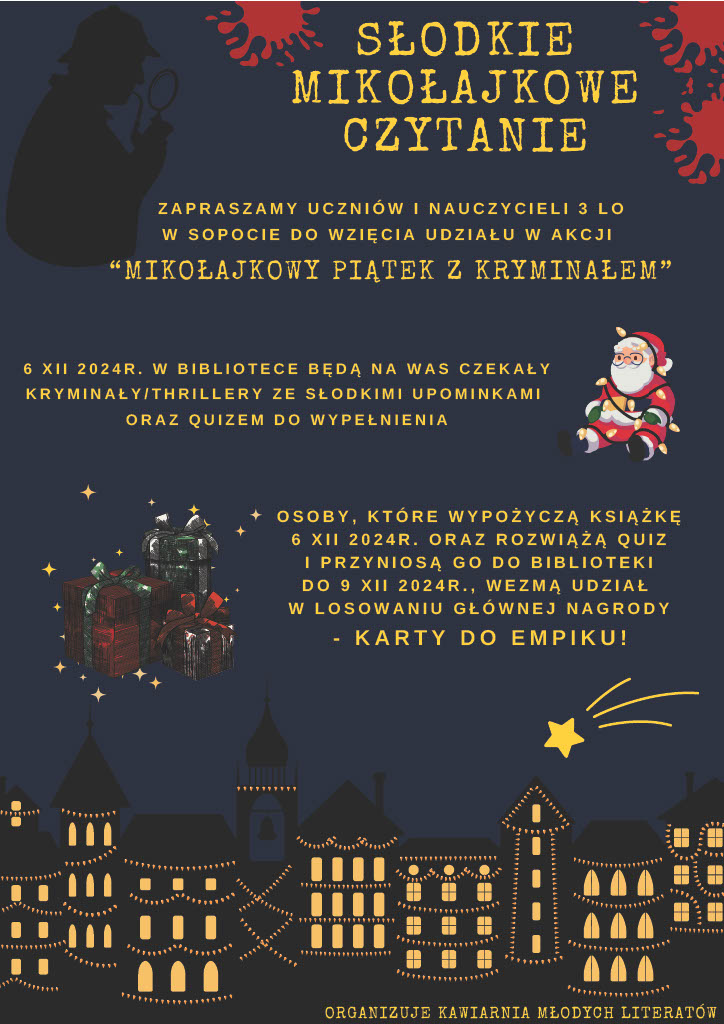 Zapraszamy społeczność 3LO do wzięcia udziału w akcji "Mikołajkowy Piątek z Kryminałem". Odbędzie sie ona 6 XII 2024r. w bibliotece szkolnej. Tego dnia będzie można wypożyczyć kryminał lub thriller wraz ze słodkim upominkiem :)  Każda osoba uczestnicząca w akcji otrzyma również konkursowy quiz do rozwiązania i weźmie udział w losowaniu nagrody głównej czyli karty upominkowej do Empiku.