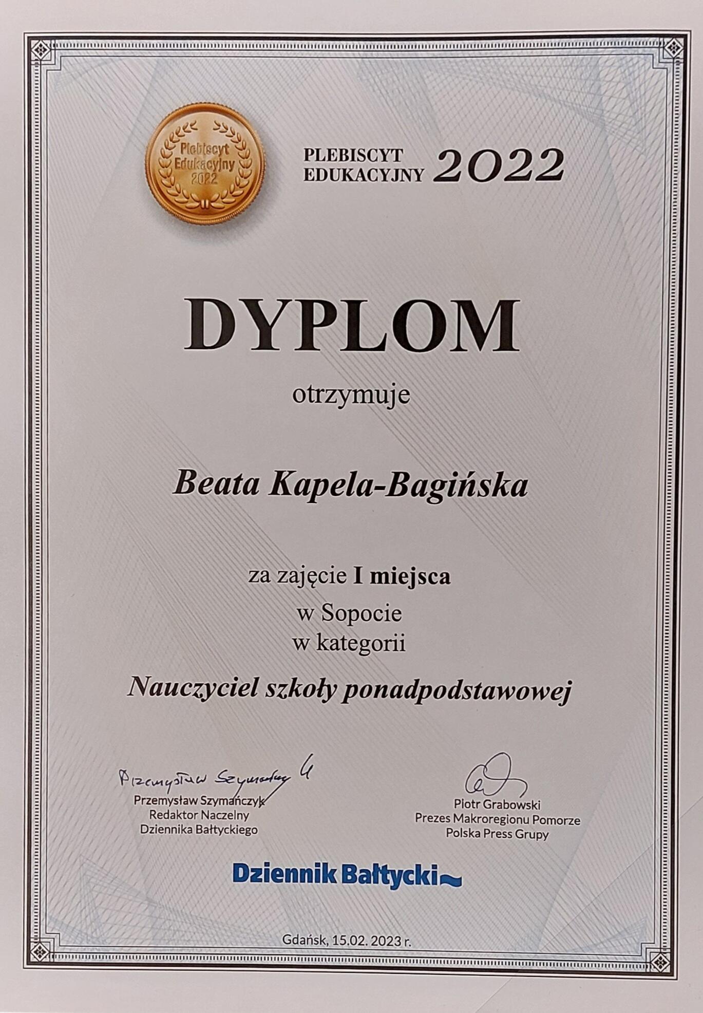 Nasza Nauczycielka Pani Beata Kapela-Bagińska zajęła I miejsce w kategorii Nauczyciel szkoły ponadpodstawowej w Sopocie.