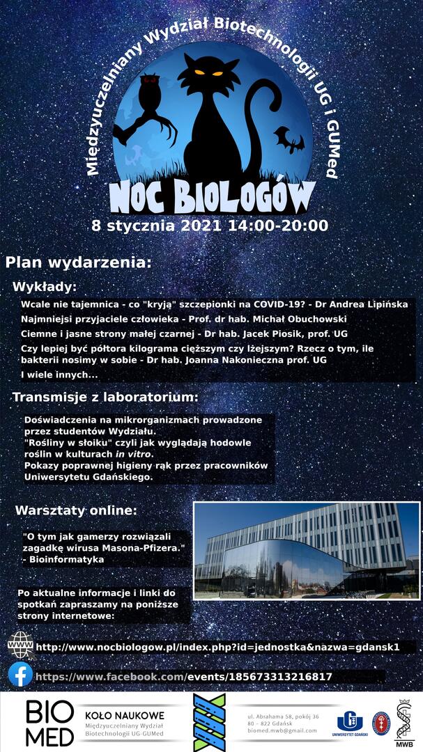 8 stycznia 2021 roku odbędzie się kolejna edycja Nocy Biologów - tym razem online . Serdecznie zapraszamy młodzież  do wzięcia udziału w wydarzeniach przygotowanych przez Międzyuczelniany Wydział Biotechnologii Uniwersytetu Gdańskiego i Gdańskiego Uniwersytetu Medycznego.