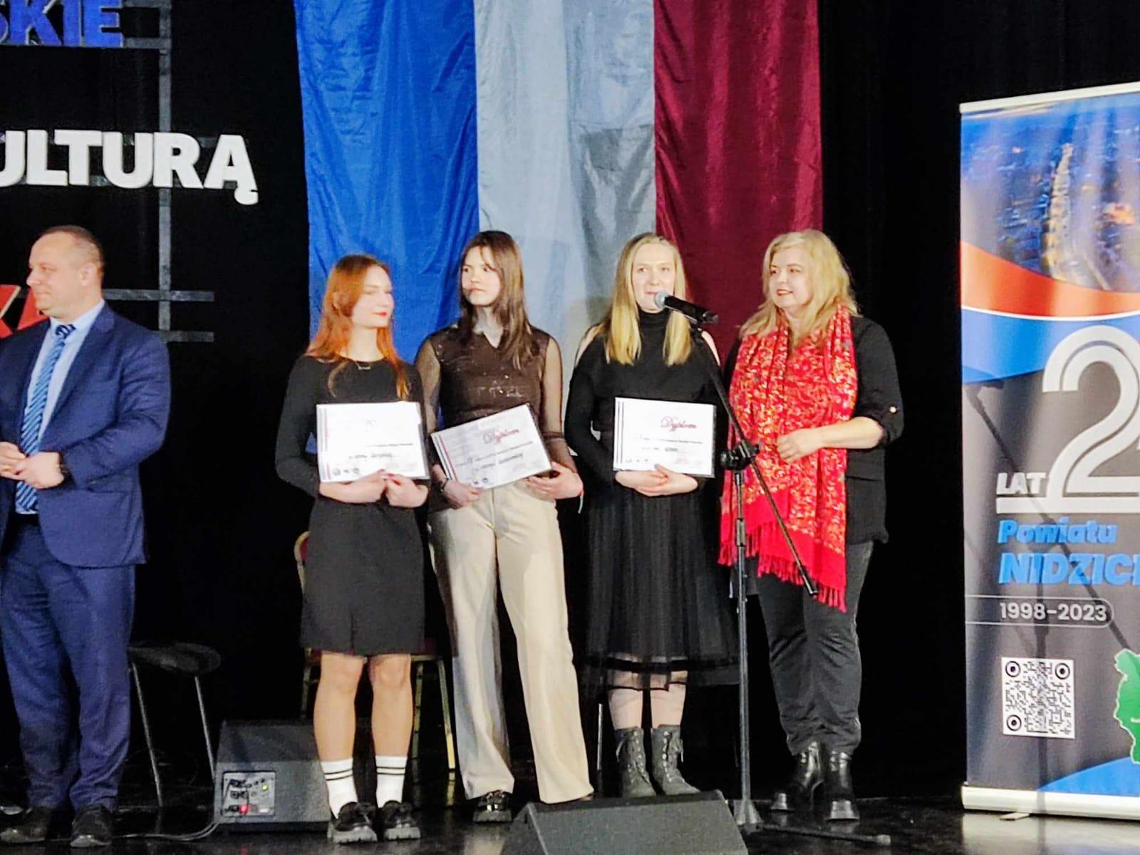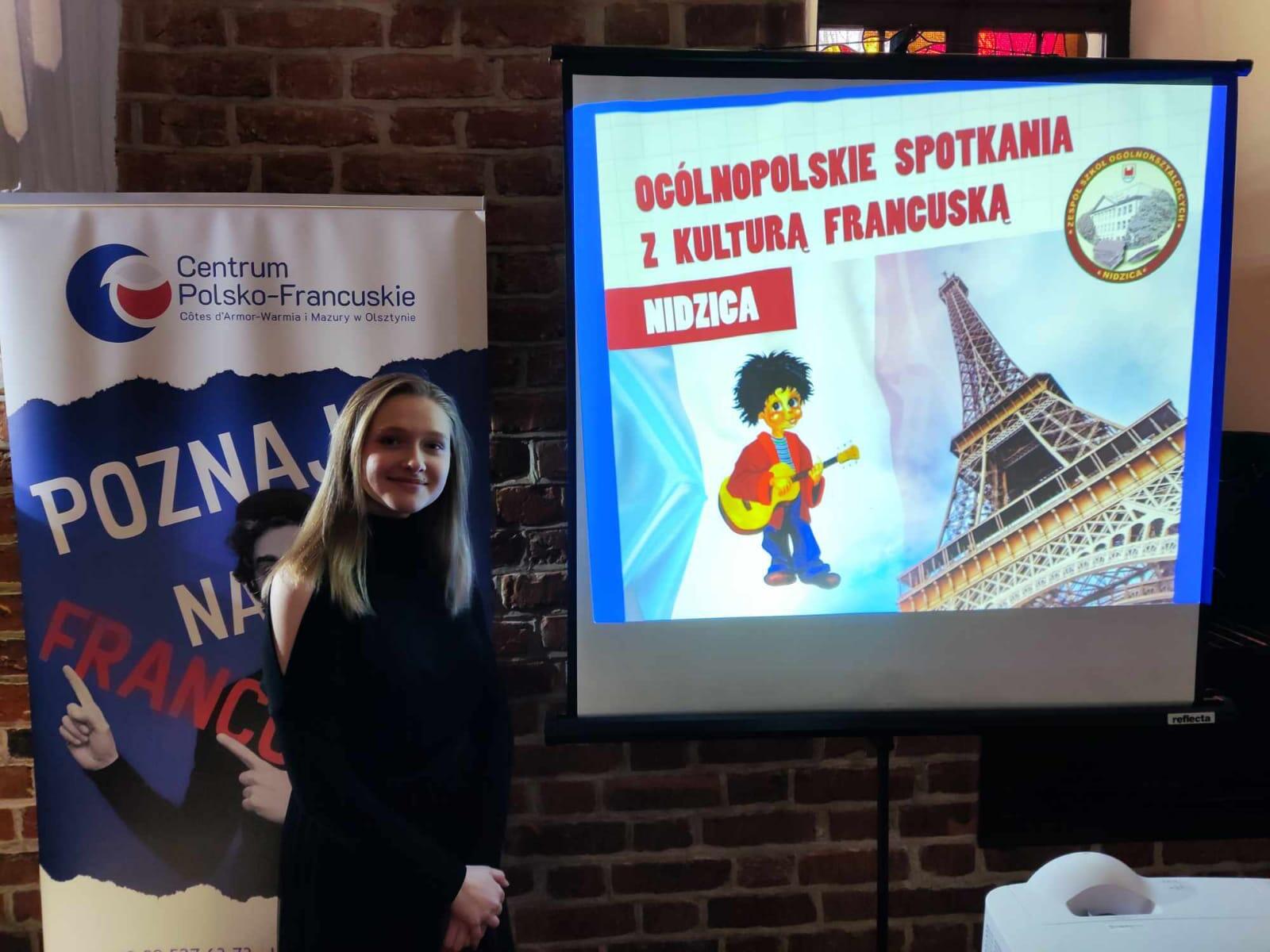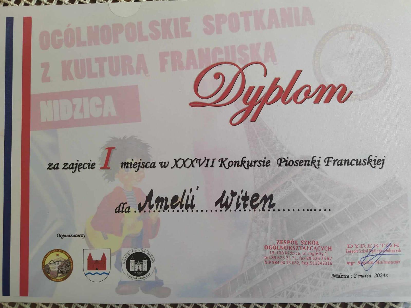 Amelia Witen, uczennica klasy IVA, zajęła I miejsce podczas Ogólnoplskich Spotkań z Kulturą Francuską w Nidzicy. Amelia brawurowo wykonała dwa utwory francuskich artystek: Patricii Kaas oraz Barbary Pravi i zdobyła główną nagrodę, którą jest wyjazd do Francji. Wielkie Gratulacje!!!