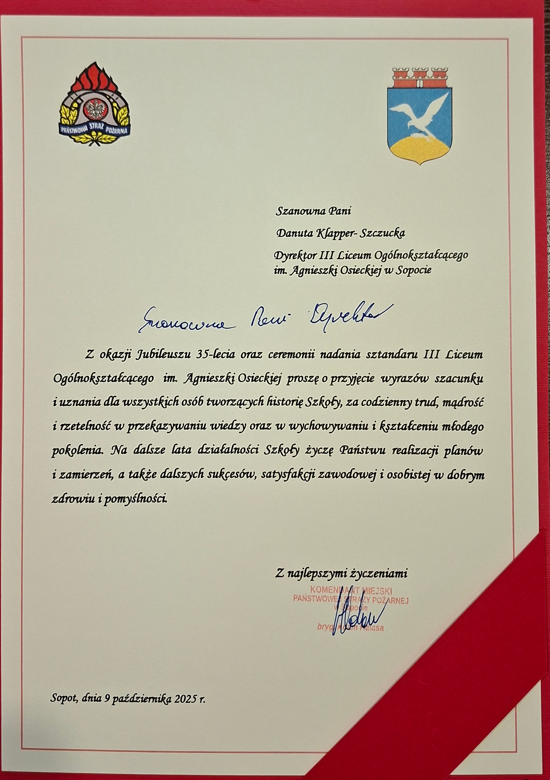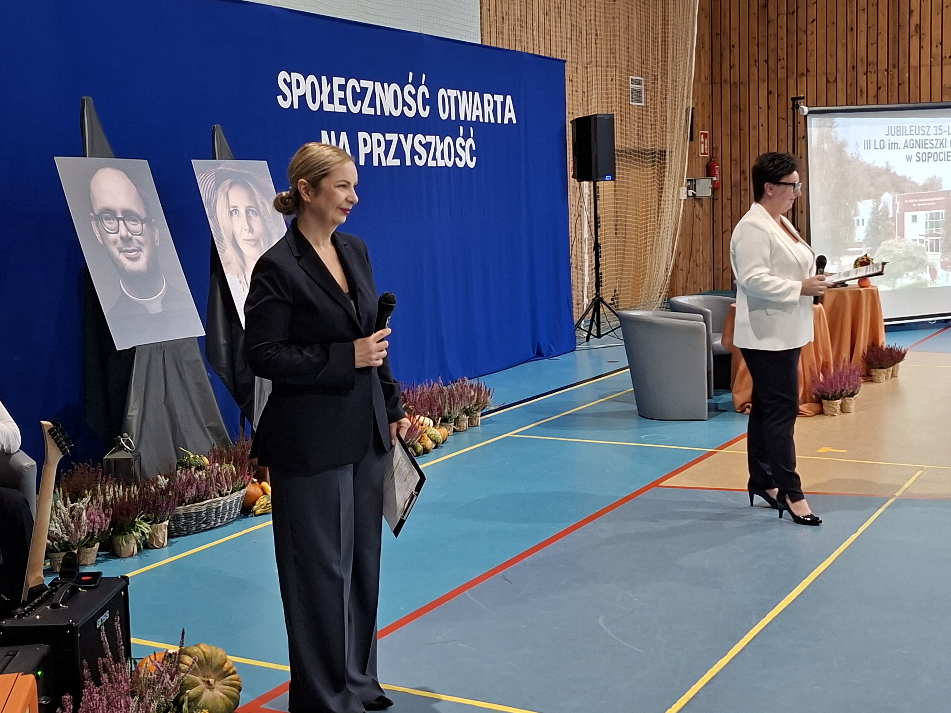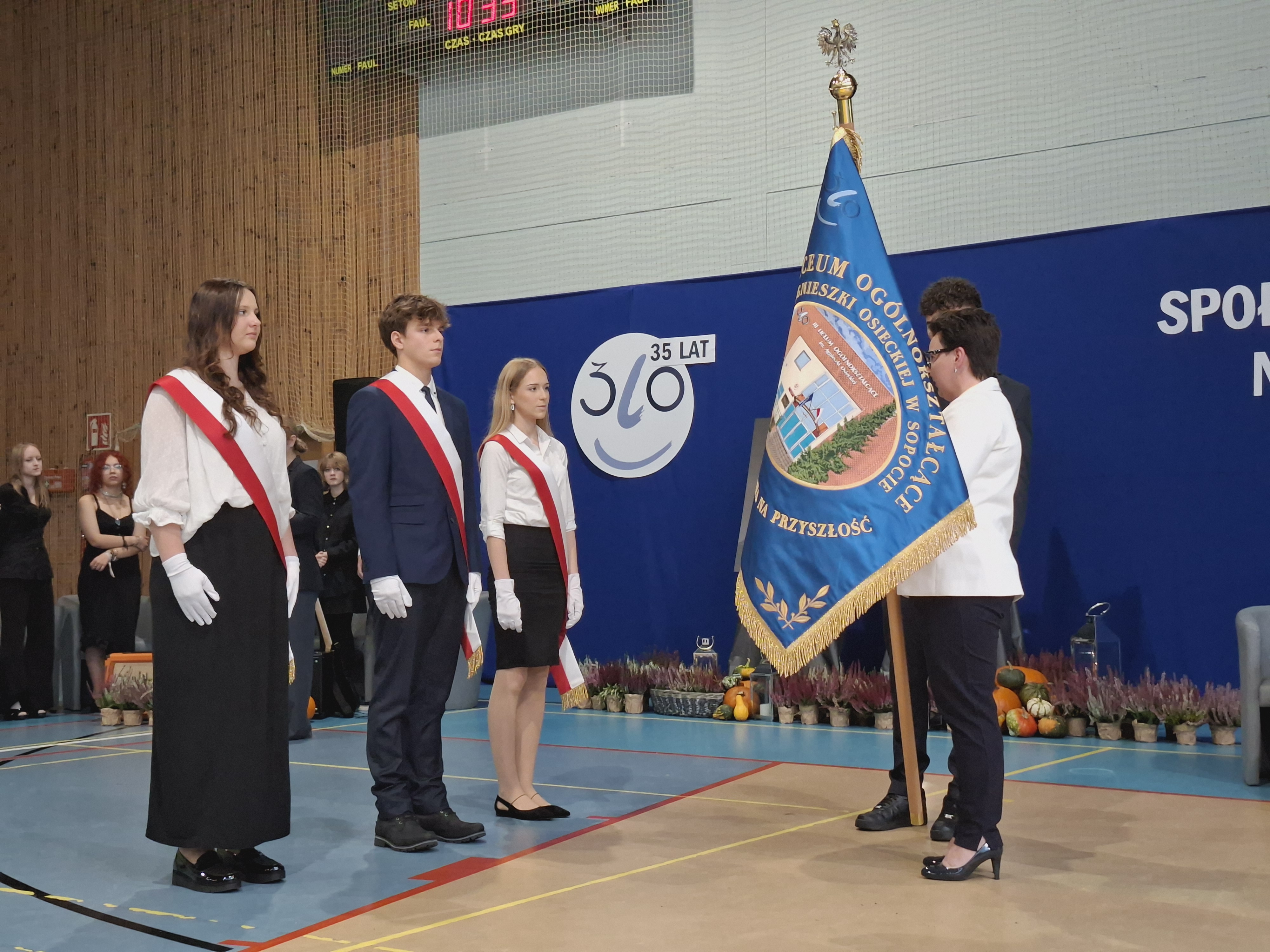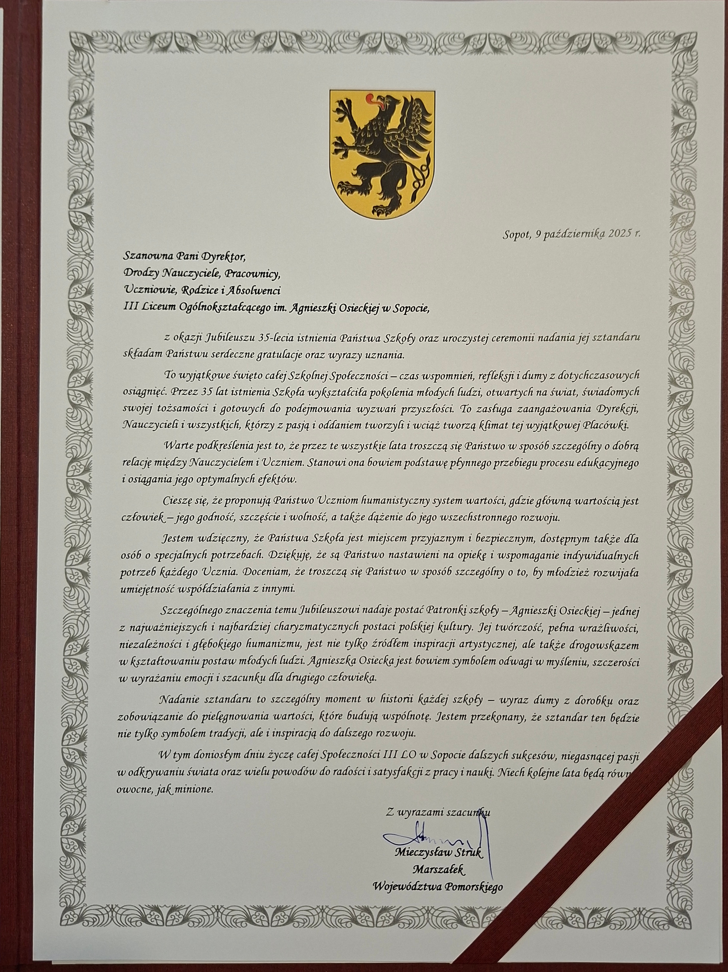 Kilka dni wcześniej, tj. 4 października, podczas koncelebrowanej Mszy Świętej, Sztandar Szkoły został poświęcony. W dniu urodzin naszej Patronki, Agnieszki Osieckiej odbyła się uroczystość szkolna połączona z obchodami Jubileuszu 35-lecia Szkoły i nadaniem jej Sztandaru. Wydarzenie to uświetniła obecność przedstawicieli władz Miasta Sopotu, Wydziału Edukacji, Kuratorium Oświaty, Służb Mundurowych, Dyrektorów sopockich placówek kulturalno-oświatowych i ich zastępców oraz przedstawicieli fundacji i emerytowanych nauczycieli. Podczas oficjalnej części uroczystości doszło do przekazania Sztandaru Pani Dyrektor przez Panią Prezydentkę Sopotu a chwilę później do przejęcia tego Symbolu Szkoły przez Poczet Sztandarowy i do ich ślubowania. W drugiej części uroczystości odbyliśmy podróż sentymentalną przez twórczość Patronki naszego liceum.