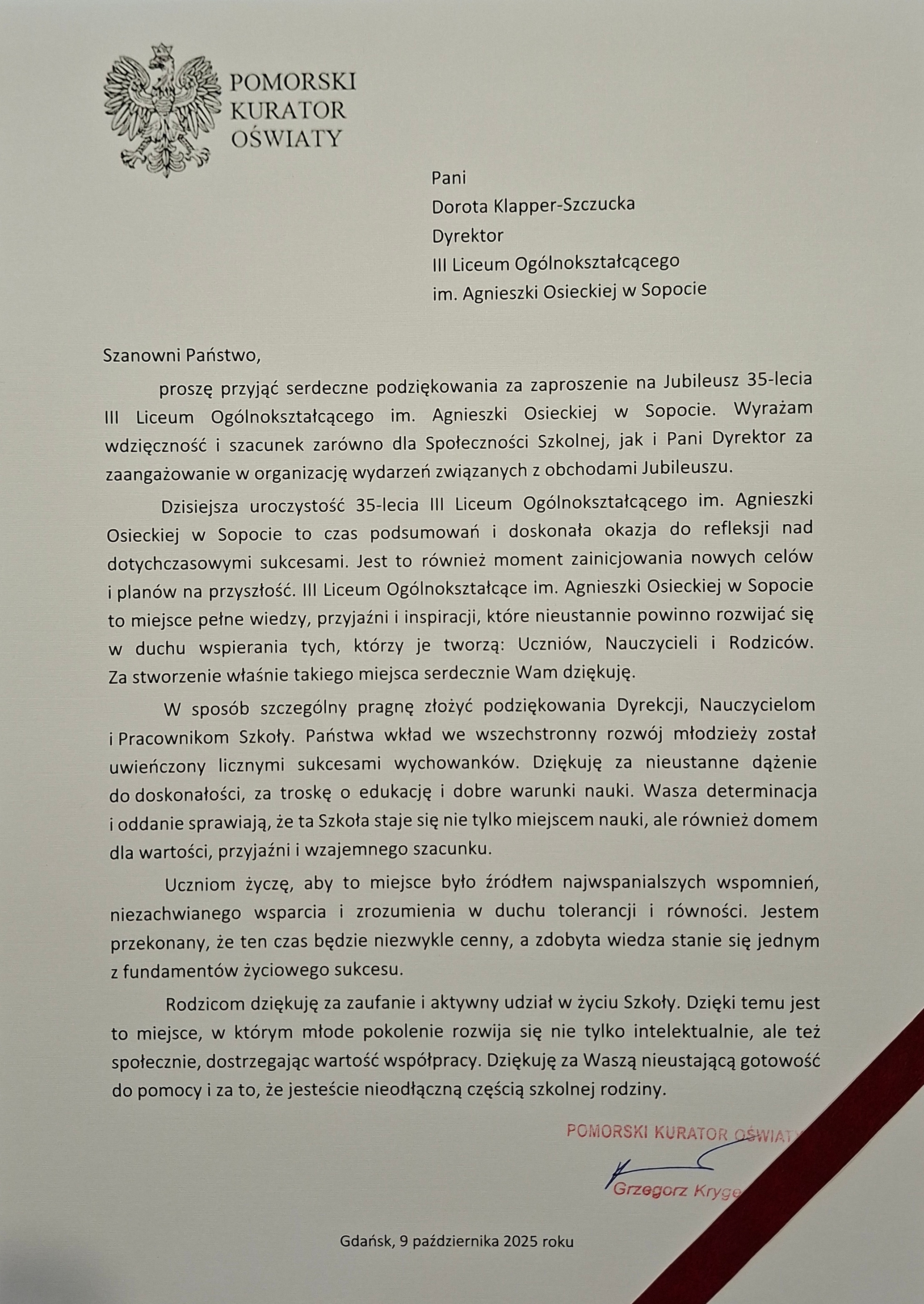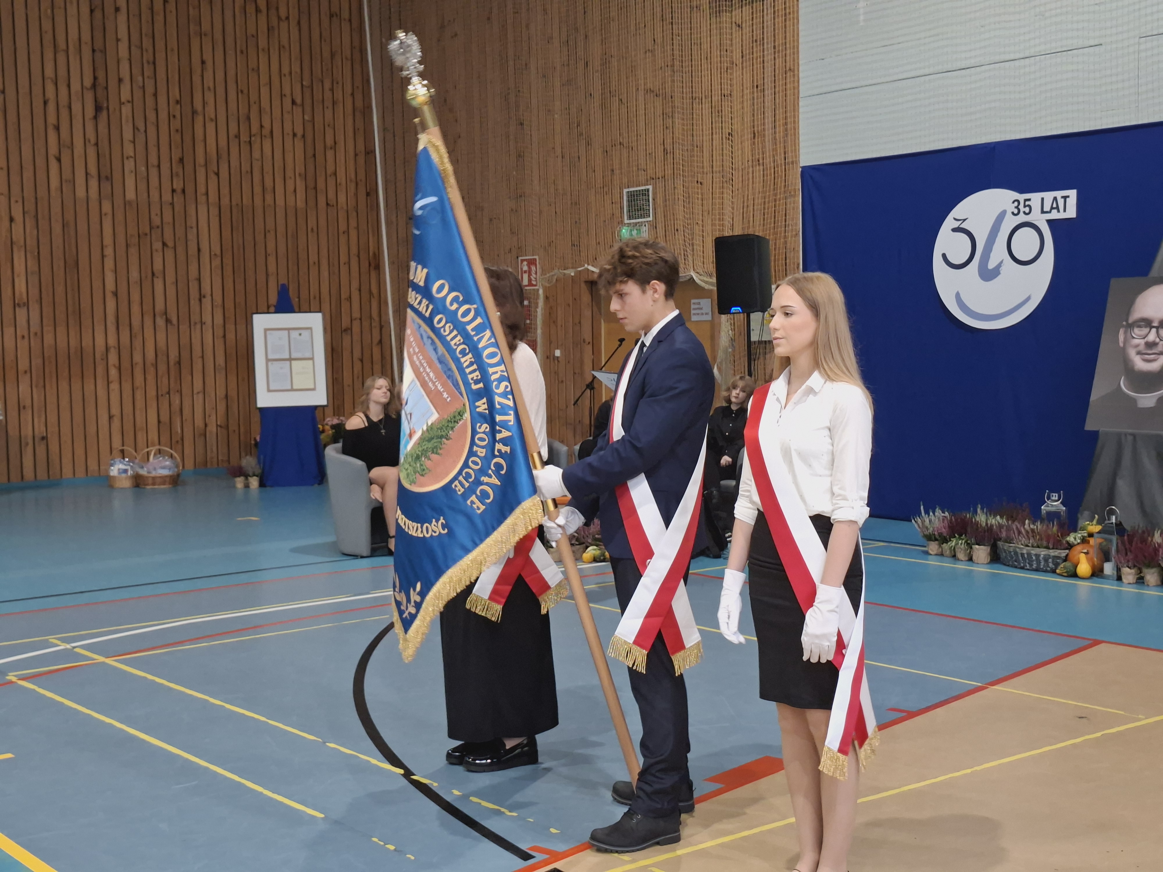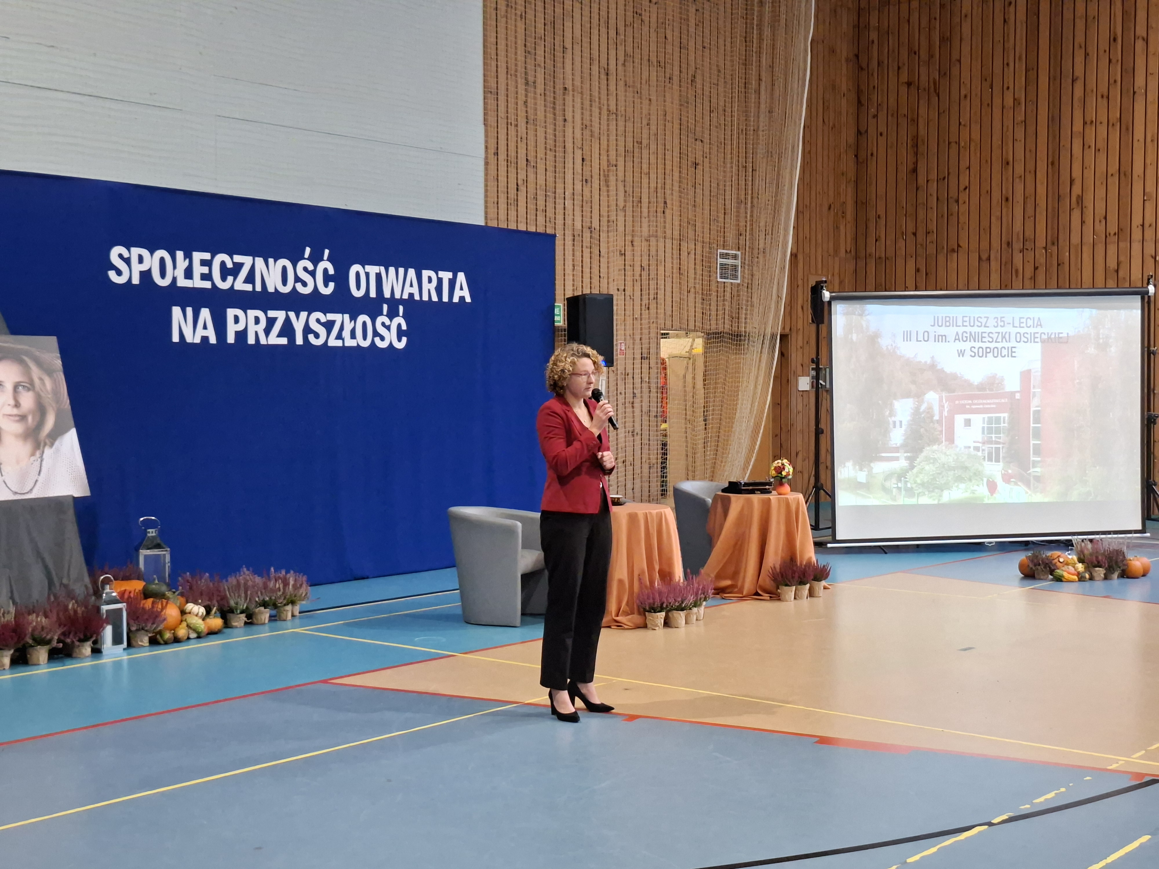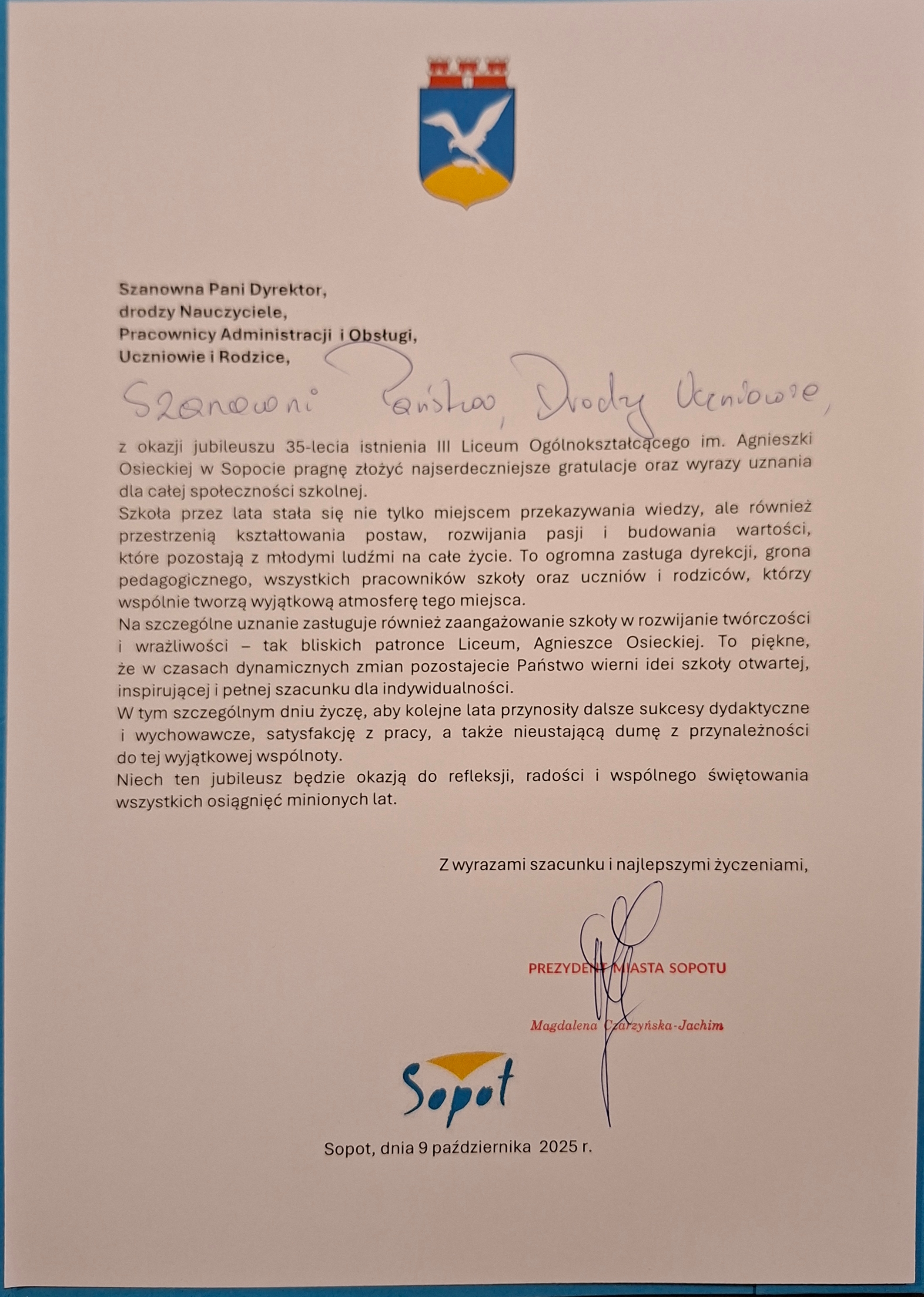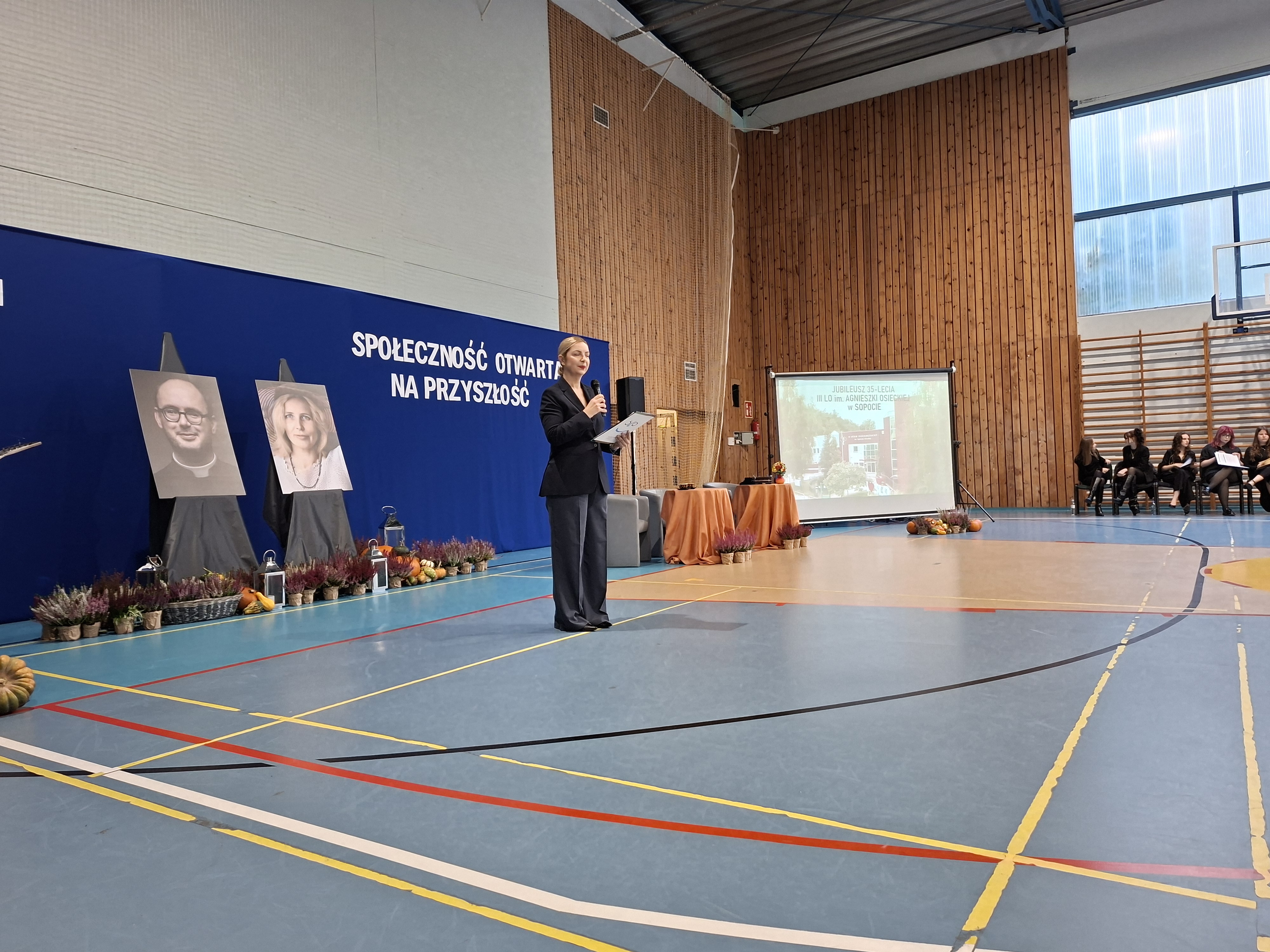 Kilka dni wcześniej, tj. 4 października, podczas koncelebrowanej Mszy Świętej, Sztandar Szkoły został poświęcony. W dniu urodzin naszej Patronki, Agnieszki Osieckiej odbyła się uroczystość szkolna połączona z obchodami Jubileuszu 35-lecia Szkoły i nadaniem jej Sztandaru. Wydarzenie to uświetniła obecność przedstawicieli władz Miasta Sopotu, Wydziału Edukacji, Kuratorium Oświaty, Służb Mundurowych, Dyrektorów sopockich placówek kulturalno-oświatowych i ich zastępców oraz przedstawicieli fundacji i emerytowanych nauczycieli. Podczas oficjalnej części uroczystości doszło do przekazania Sztandaru Pani Dyrektor przez Panią Prezydentkę Sopotu a chwilę później do przejęcia tego Symbolu Szkoły przez Poczet Sztandarowy i do ich ślubowania. W drugiej części uroczystości odbyliśmy podróż sentymentalną przez twórczość Patronki naszego liceum.
