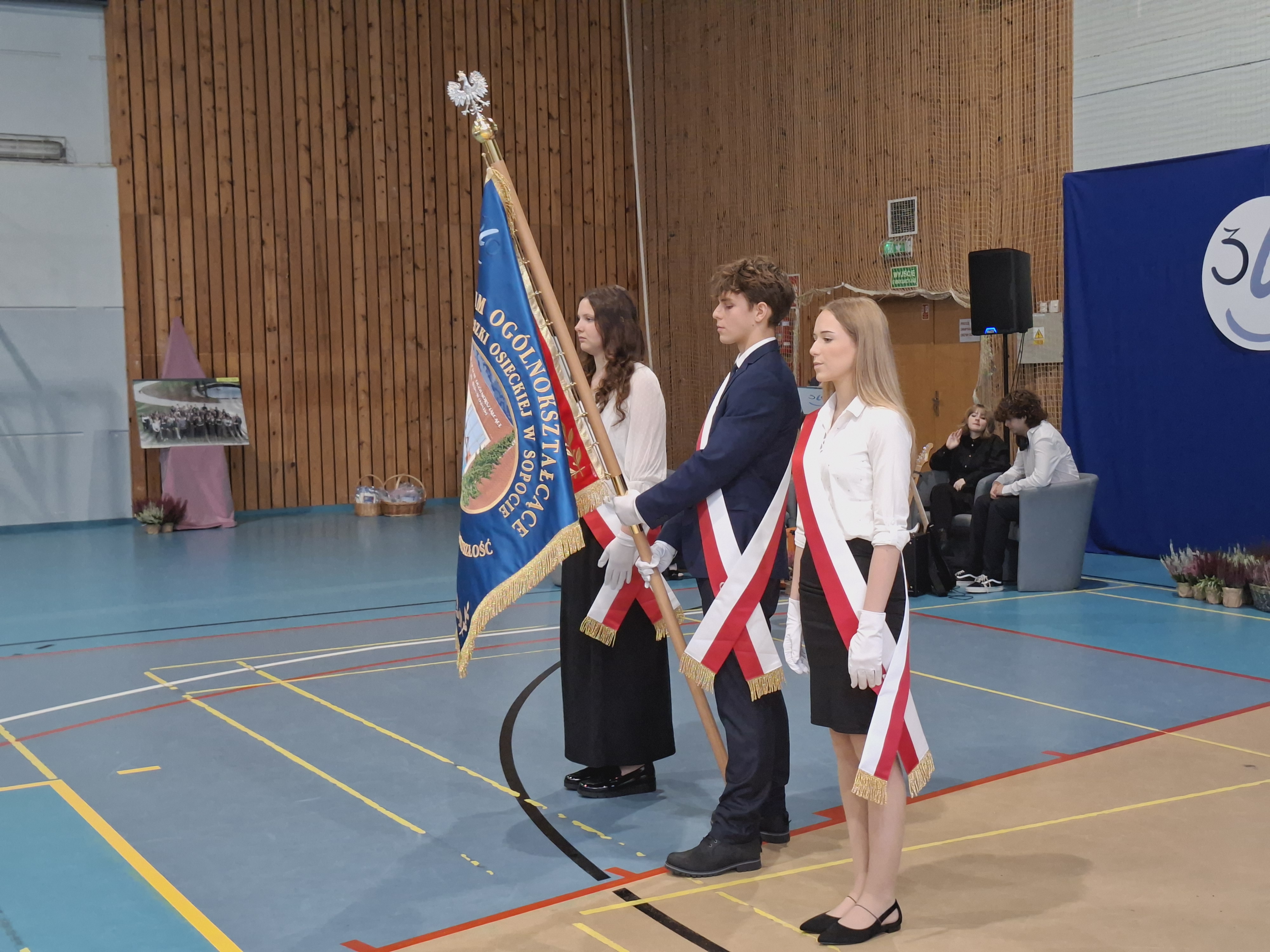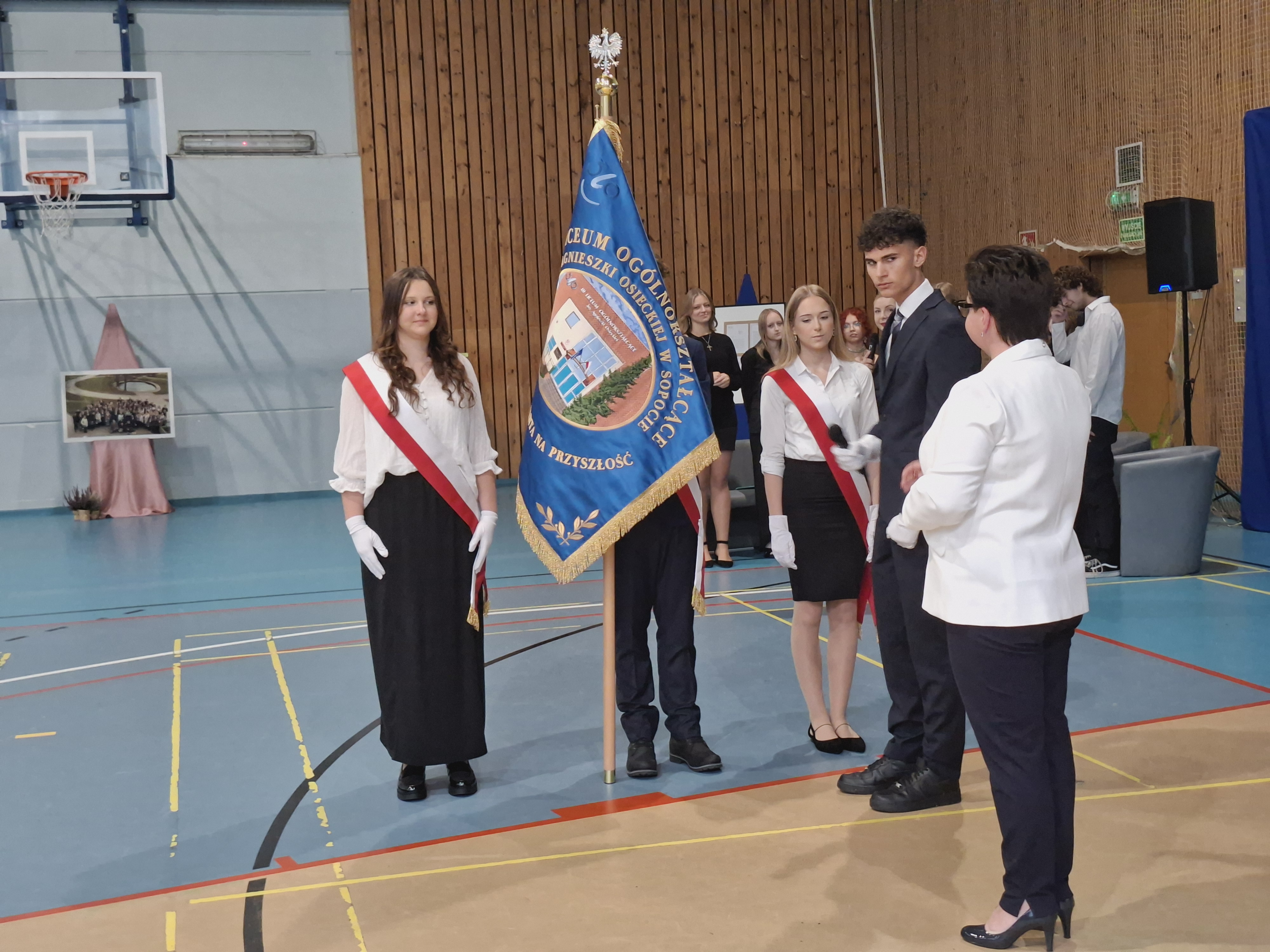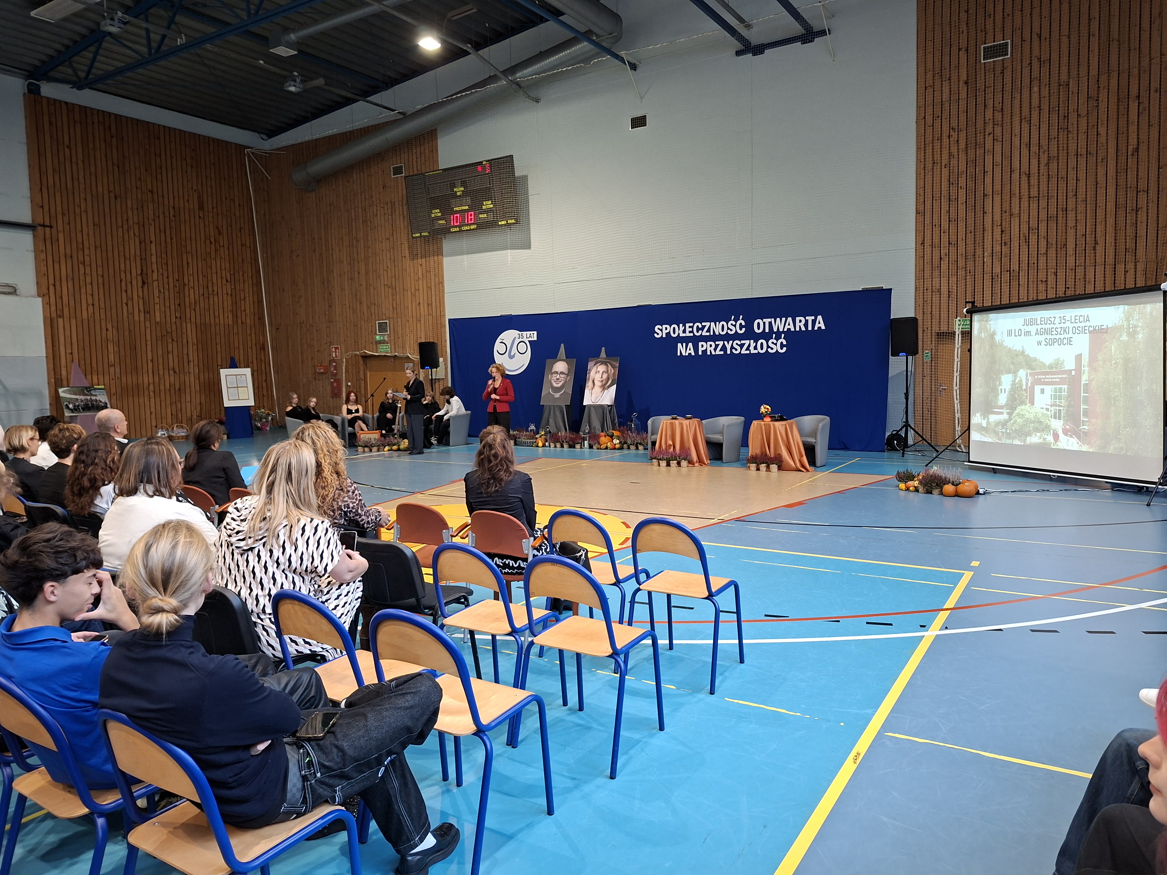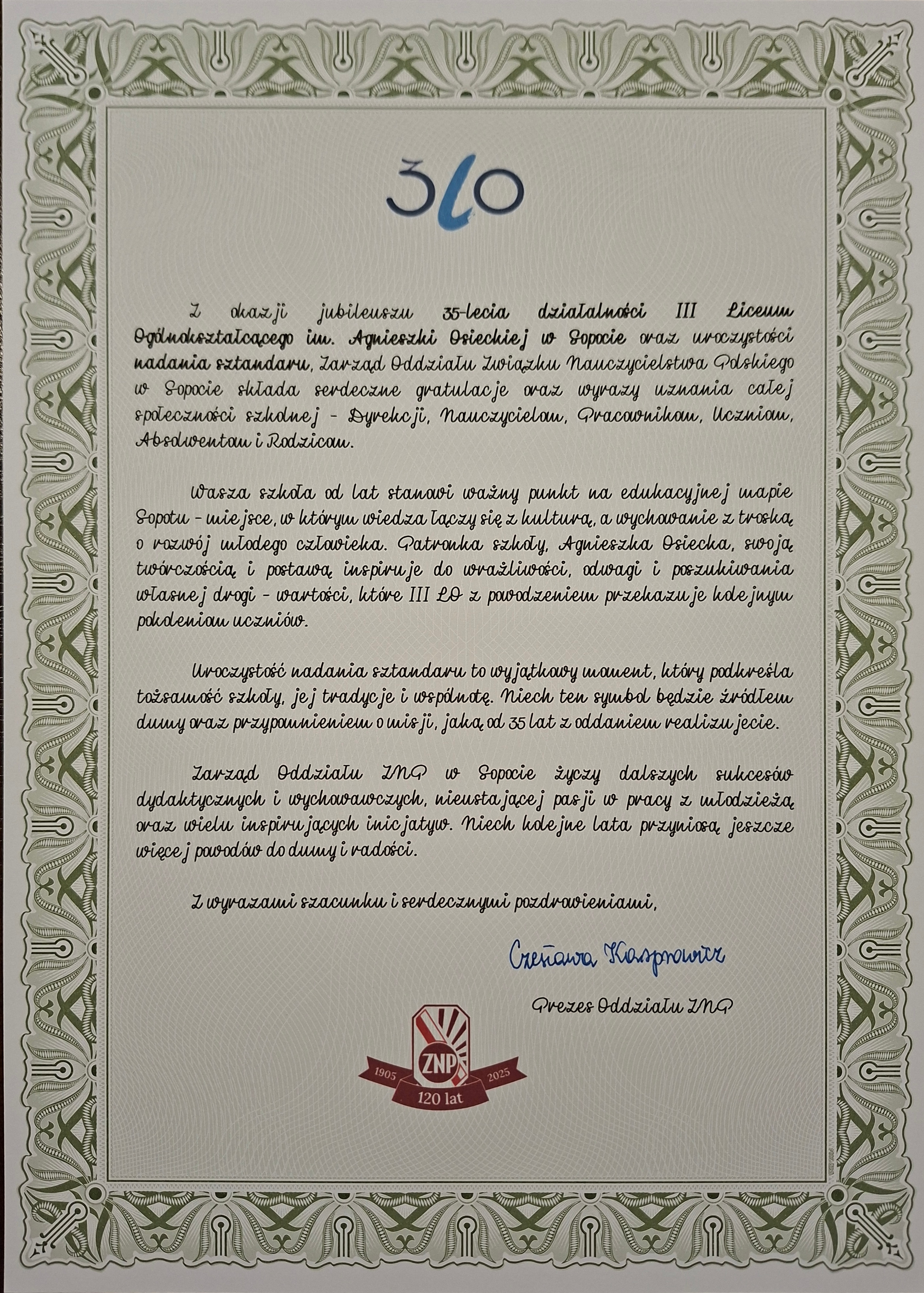 Kilka dni wcześniej, tj. 4 października, podczas koncelebrowanej Mszy Świętej, Sztandar Szkoły został poświęcony. W dniu urodzin naszej Patronki, Agnieszki Osieckiej odbyła się uroczystość szkolna połączona z obchodami Jubileuszu 35-lecia Szkoły i nadaniem jej Sztandaru. Wydarzenie to uświetniła obecność przedstawicieli władz Miasta Sopotu, Wydziału Edukacji, Kuratorium Oświaty, Służb Mundurowych, Dyrektorów sopockich placówek kulturalno-oświatowych i ich zastępców oraz przedstawicieli fundacji i emerytowanych nauczycieli. Podczas oficjalnej części uroczystości doszło do przekazania Sztandaru Pani Dyrektor przez Panią Prezydentkę Sopotu a chwilę później do przejęcia tego Symbolu Szkoły przez Poczet Sztandarowy i do ich ślubowania. W drugiej części uroczystości odbyliśmy podróż sentymentalną przez twórczość Patronki naszego liceum.