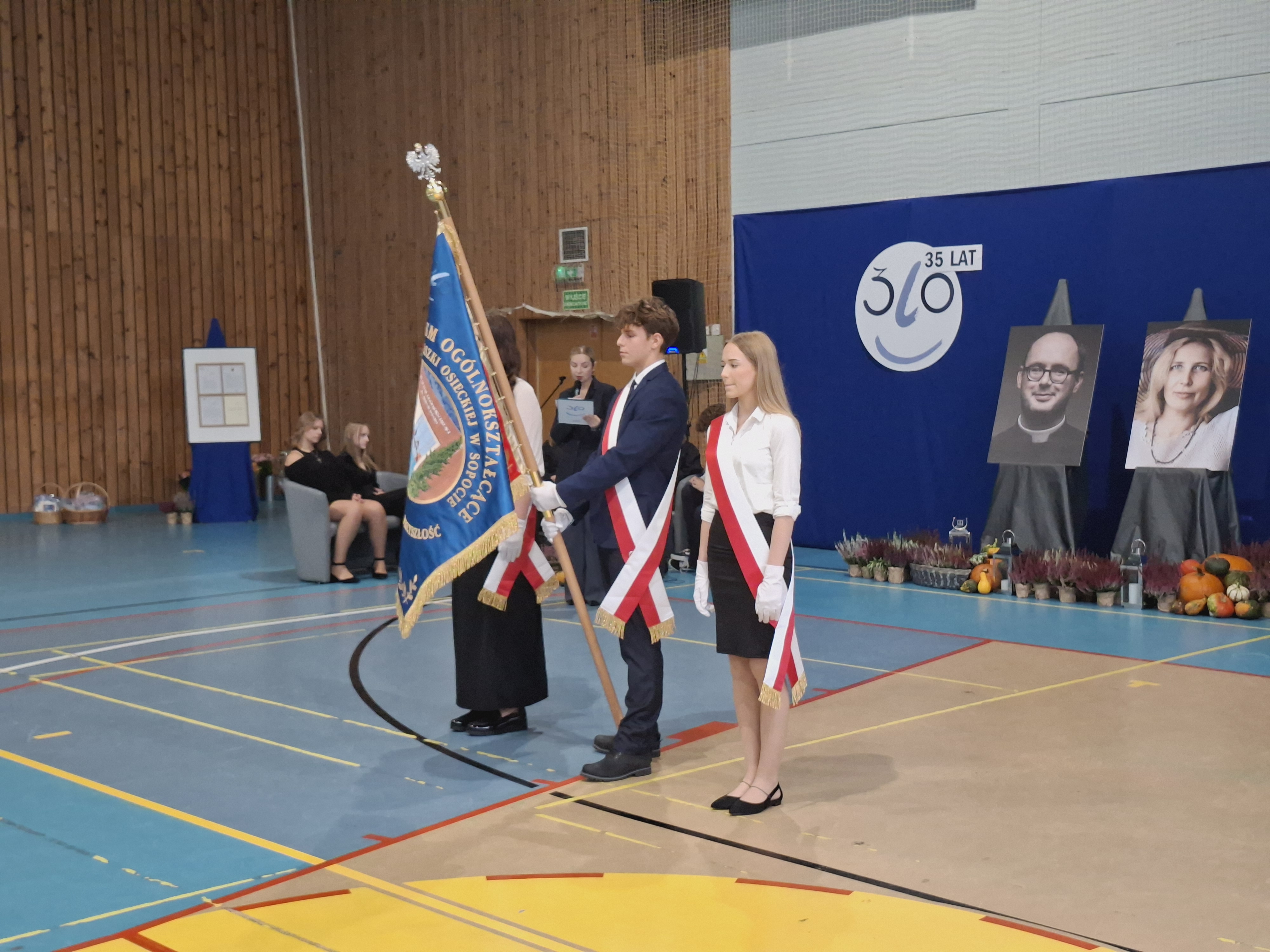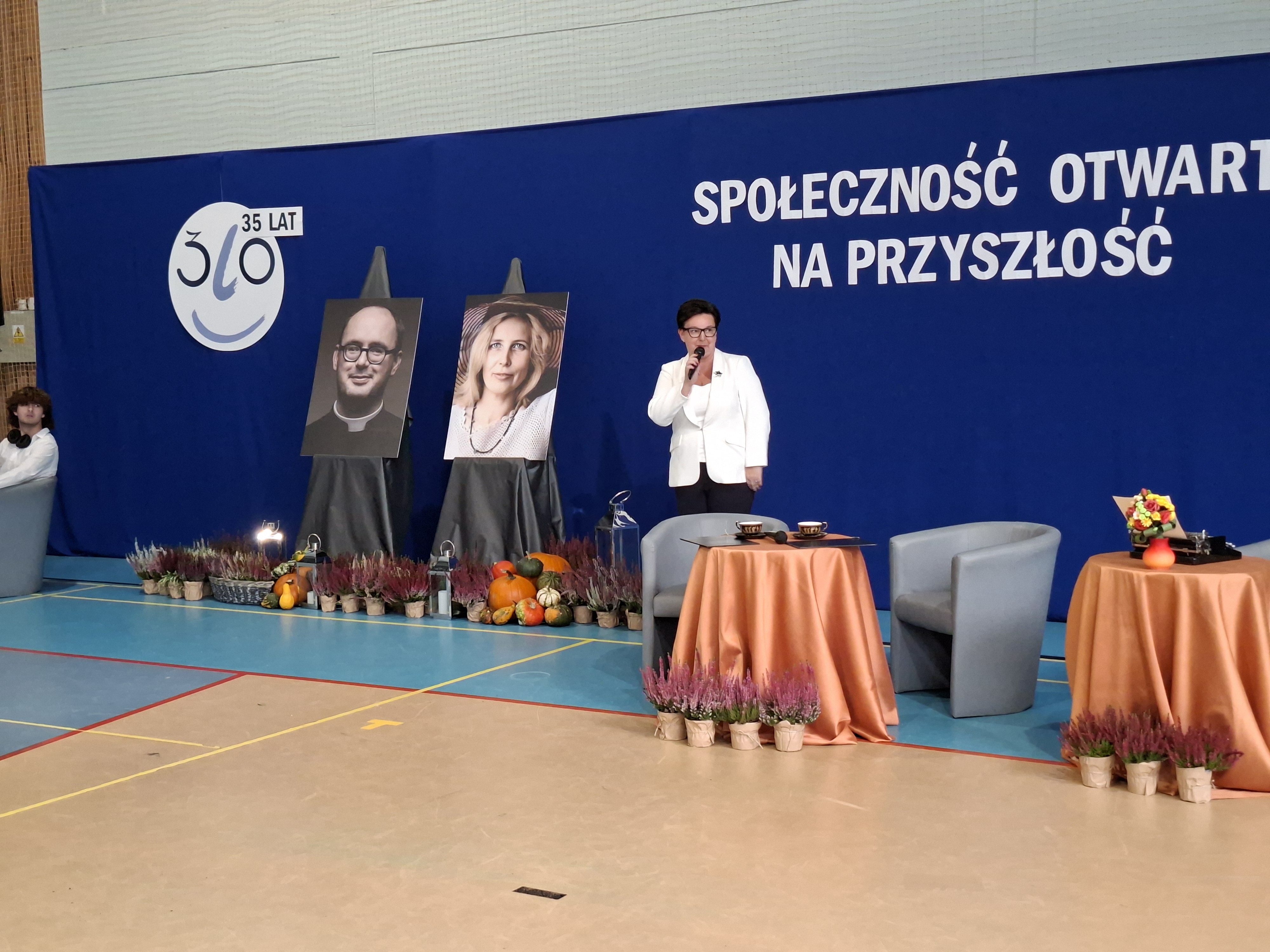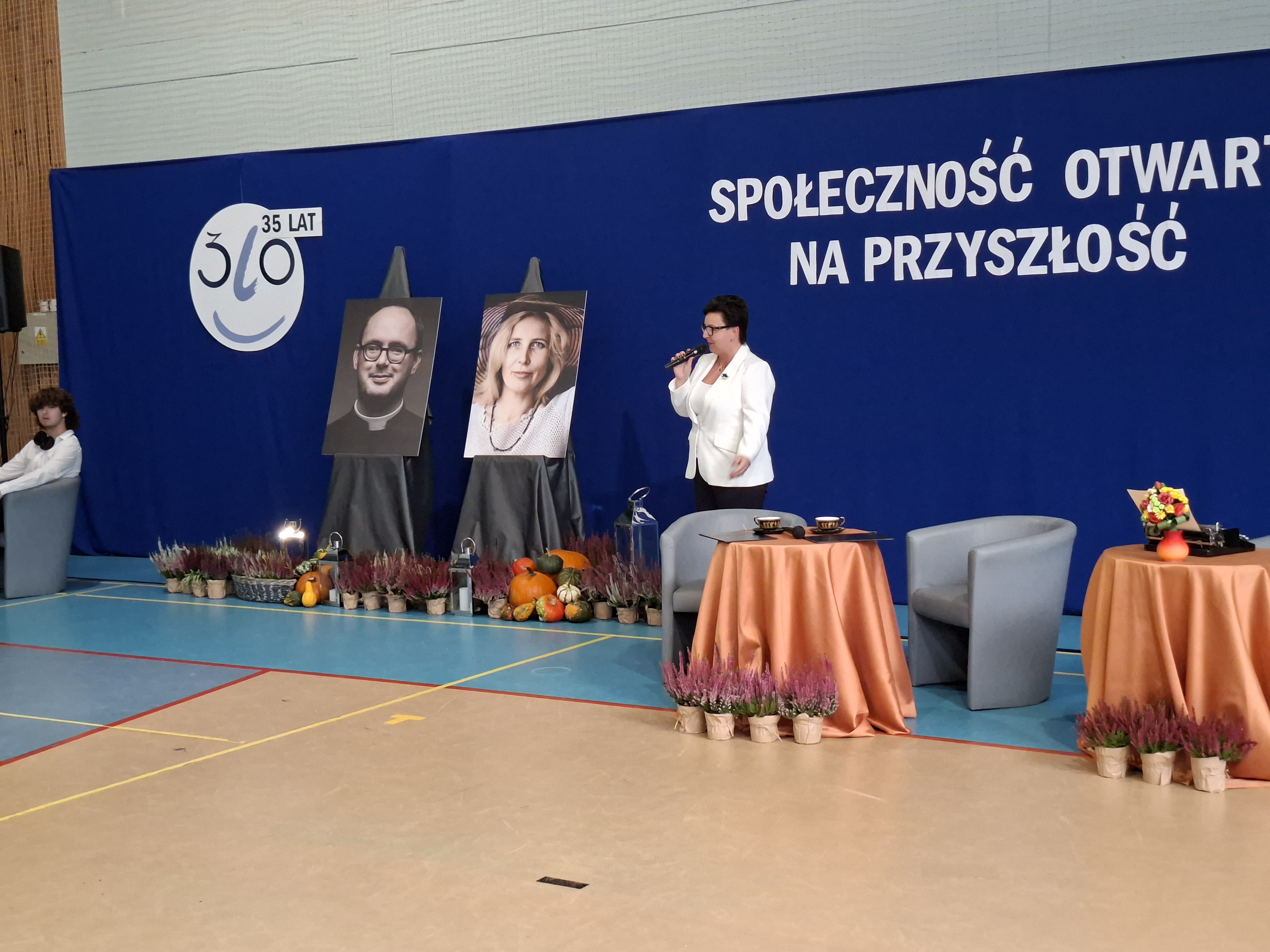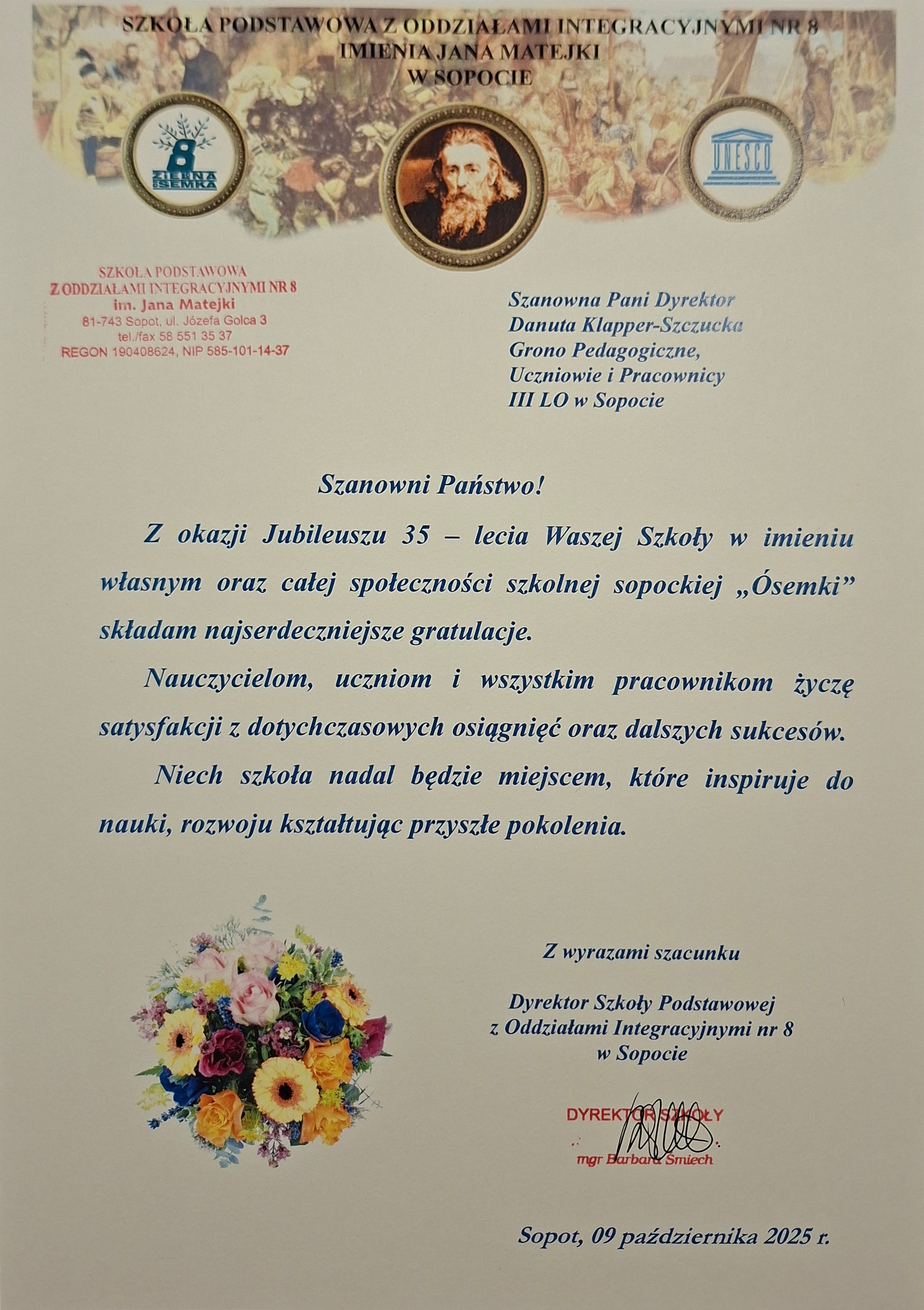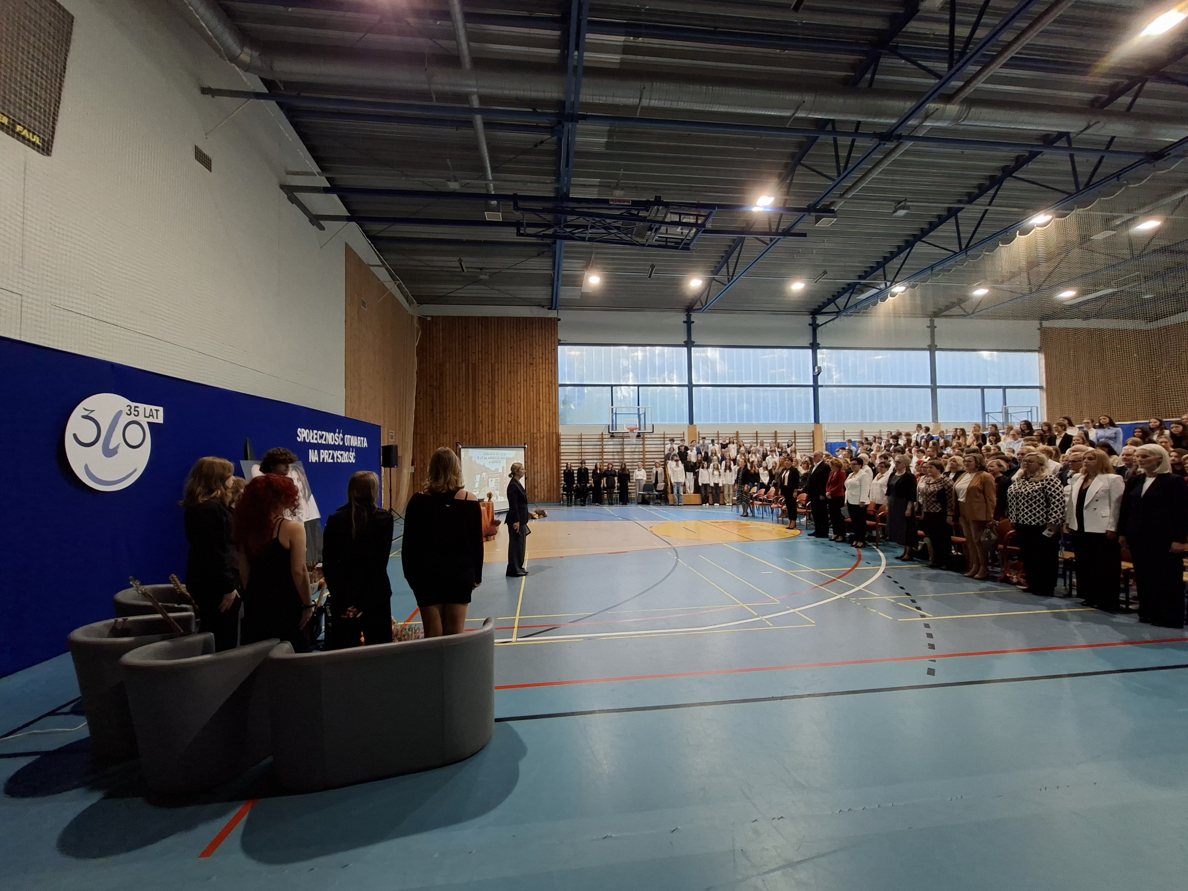 9 października obchodziliśmy Jubileusz 35-lecia połączony z nadaniem naszej szkole Sztandaru. Został on ufundowany przez Prezydentkę Miasta Sopotu, Panią Magdalenę Czarzyńską-Joachim i wykonany w pracowni Haftina w Piotrkowie Trybunalskim. Motto umieszczone na sztandarze: SPOŁECZNOŚĆ OTWARTA NA PRZYSZŁOSC był jednocześnie motywem przewodnim szkolnej uroczystości.