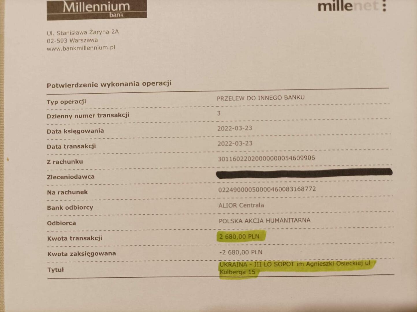 Kierujemy serdeczne podziękowania dla całej społeczności III LO w Sopocie – dla rodziców, uczniów oraz grona pedagogicznego i administracji szkoły, za włączenie się w akcję pomocy dla Ukrainy w tak trudnym dla niej czasie. Zebraliśmy wiele darów oraz pieniądze w kwocie: 2680 PLN przekazane na konto Polskiej Akcji Humanitarnej. Wasze serca są WIELKIE!