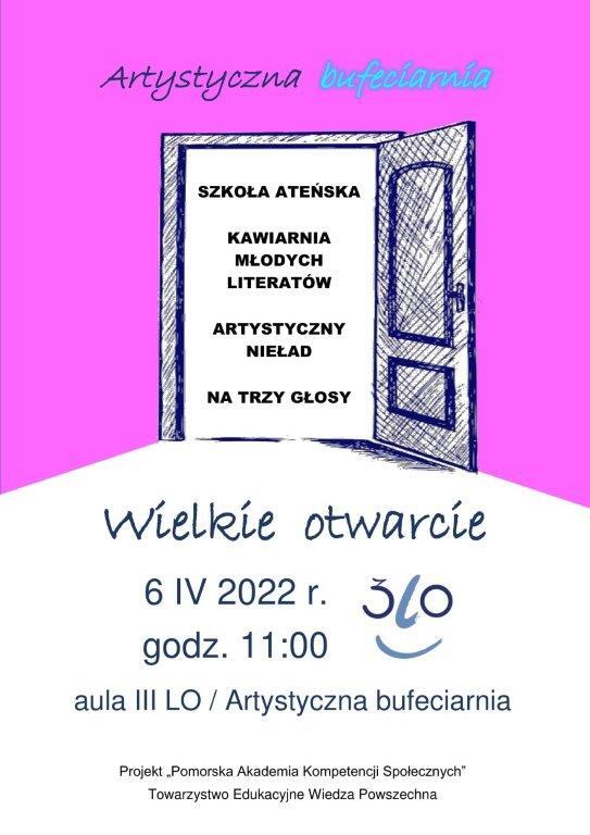 06.04.2022r. o godzinie 11.00 w III LO w Sopocie będzie miało miejsce uroczyste otwarcie Artystycznej Bufeciarni, a co za tym idzie podsumowanie Projektu „Pomorska Akademia Kompetencji Społecznych”, którego inicjatorami są Towarzystwo Edukacyjne „Wiedza Powszechna” oraz Instytut Badań Ekonomiczno-Społecznych w Gdańsku.