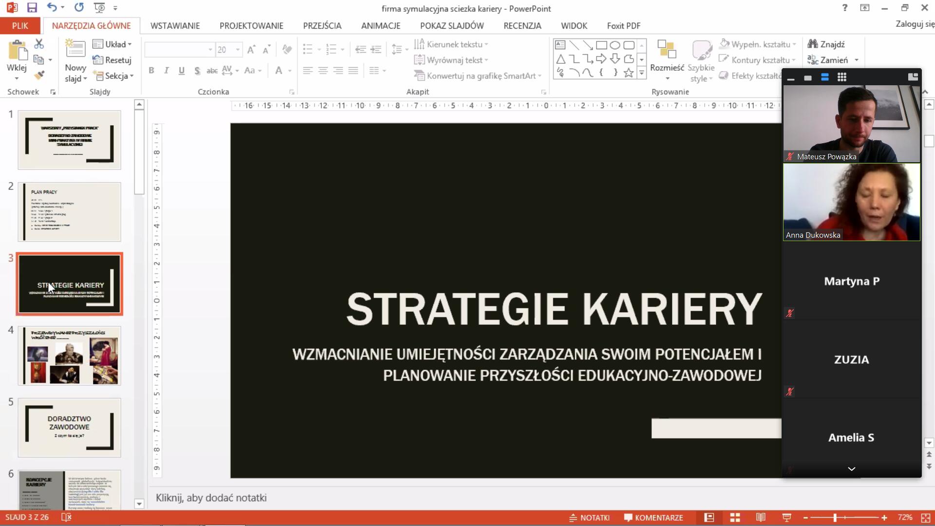 Uczniowie dowiedzieli się jak wygląda i co to jest firma symulacyjna oraz rozmawiali o podejściu do swojej przyszłej kariery zawodowej, swoich kompetencjach, możliwościach, o zmieniającym się świecie i związanych z tym zagrożeniom i korzyściom.