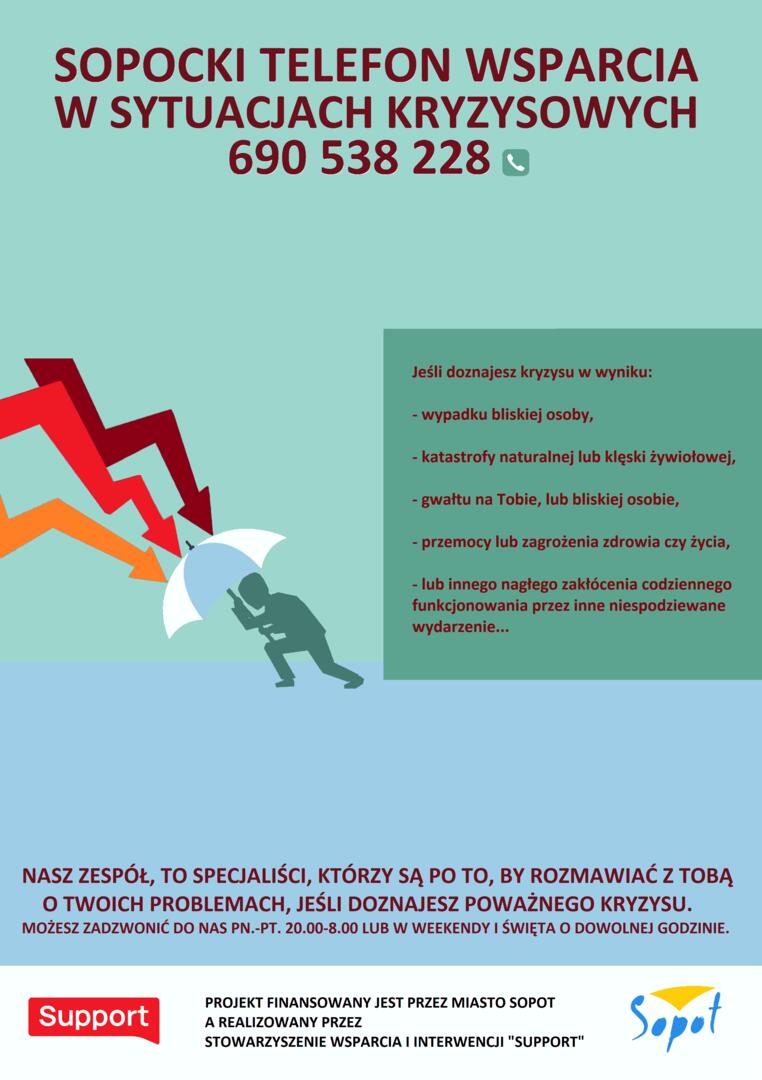 Sopocki telefon wsparcia w sytuacjach kryzysowych ma za zadanie zwiększyć dostępność specjalistycznego poradnictwa i wsparcia dla osób doświadczających przemocy, sytuacji kryzysowej zamieszkujących lub przebywających na terenie miasta Sopotu.