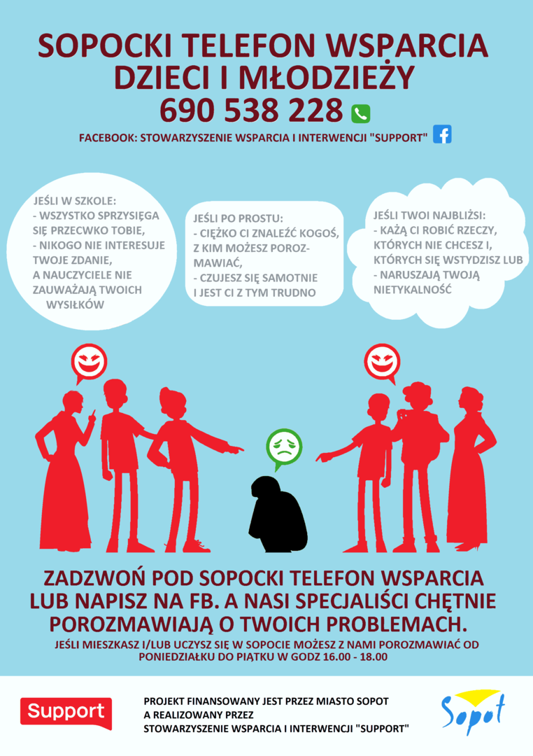 Nasi specjaliści: pedagodzy i psycholodzy w razie gwałtownego pogorszenia stanu zdrowia psychicznego, obniżonego nastroju, problemów życia codziennego dzieci i młodzieży oferują fachową pomocy dyżurują od poniedziałku do piątku w godzinach od 16.00-18.00 pod Sopockim Telefonem Wsparcia dla Dzieci i Młodzieży  nr. 690-538-228 oraz na naszym profilu fb https://www.facebook.com/Stowarzyszenie-Wsparcia-i-Interwencji-Support-111437917848909.