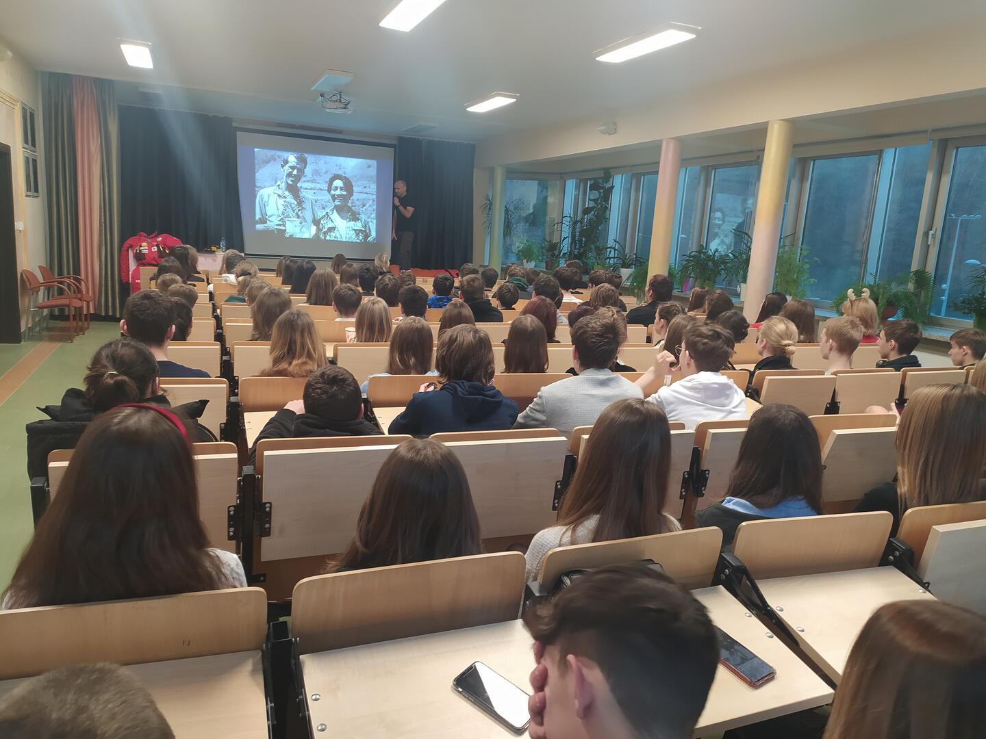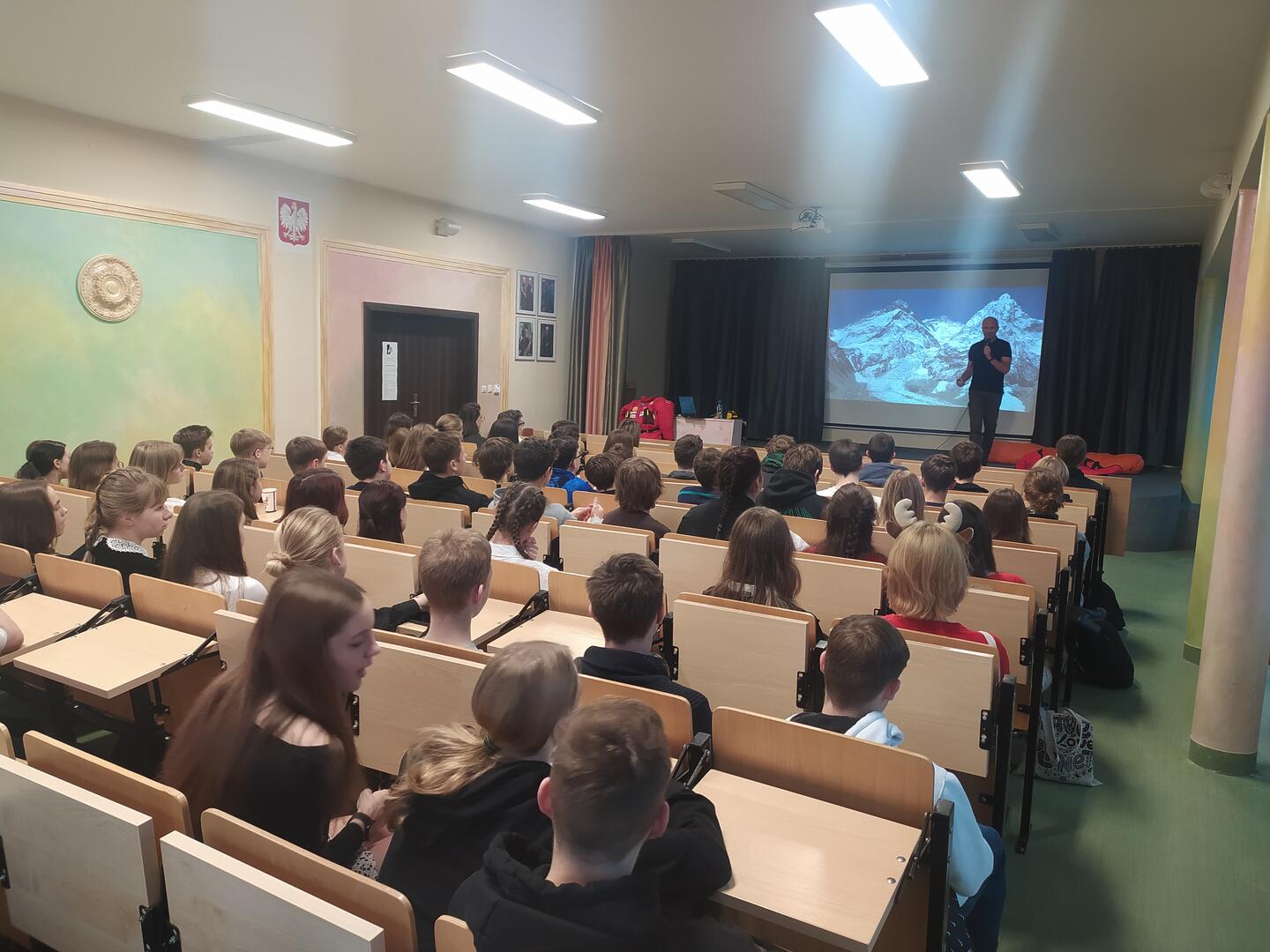 Przed klasowymi spotkaniami świątecznymi zaplanowanymi na 22 grudnia odbyło się spotkanie z niesamowitym człowiekiem Piotrem Cieszewskim. Zdobywcą Mount Everest, profesjonalnym mówcą, menadżerem, trenerem przywództwa, ambasadorem Szlachetnej Paczki, maratończykiem i taternikiem. Udział w tym spotkaniu brały klasy z rozszerzoną geografią i klasa 1D.