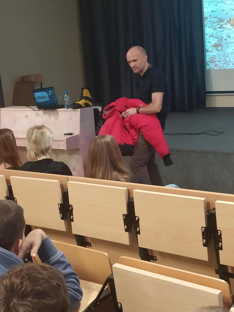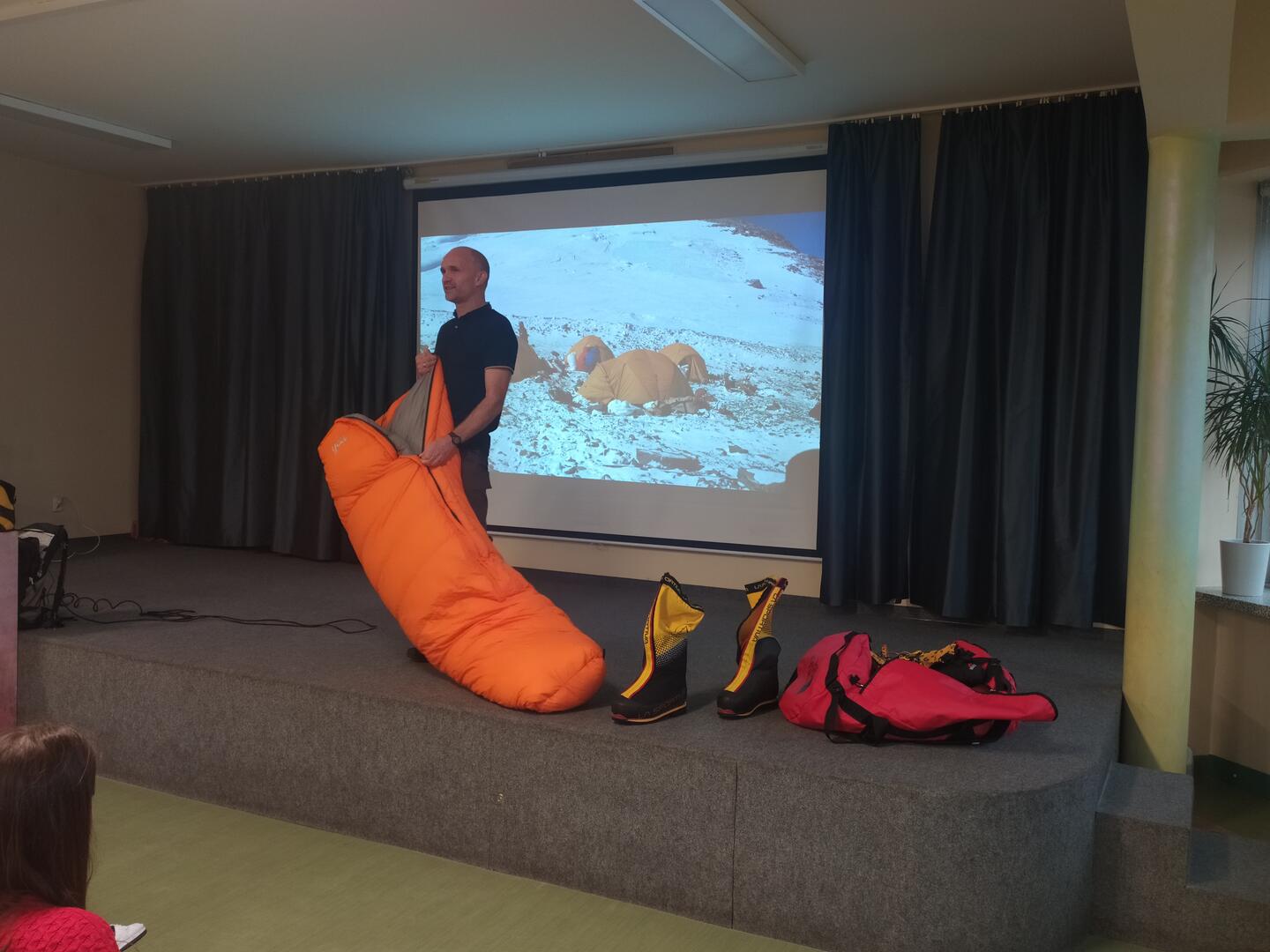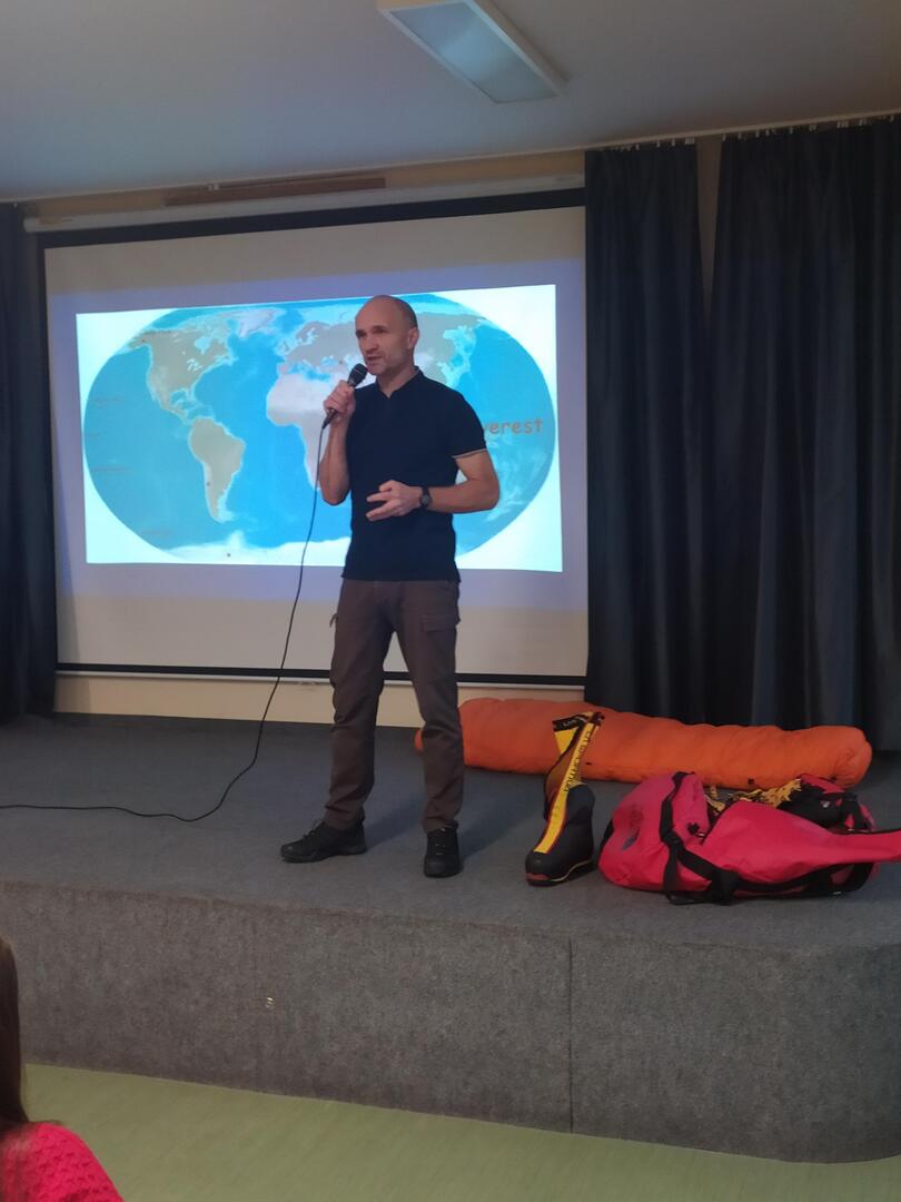 Pan Piotr opowiedział nam o swojej podróży do Nepalu i o zdobyciu najwyższej góry świata. Na nasze spotkanie zabrał ze sobą część sprzętu, który jest niezbędny do takiej wyprawy. Oprócz ciekawostek związanych z wspinaczką, bardzo dużo mówił o motywacji i pomaganiu.
