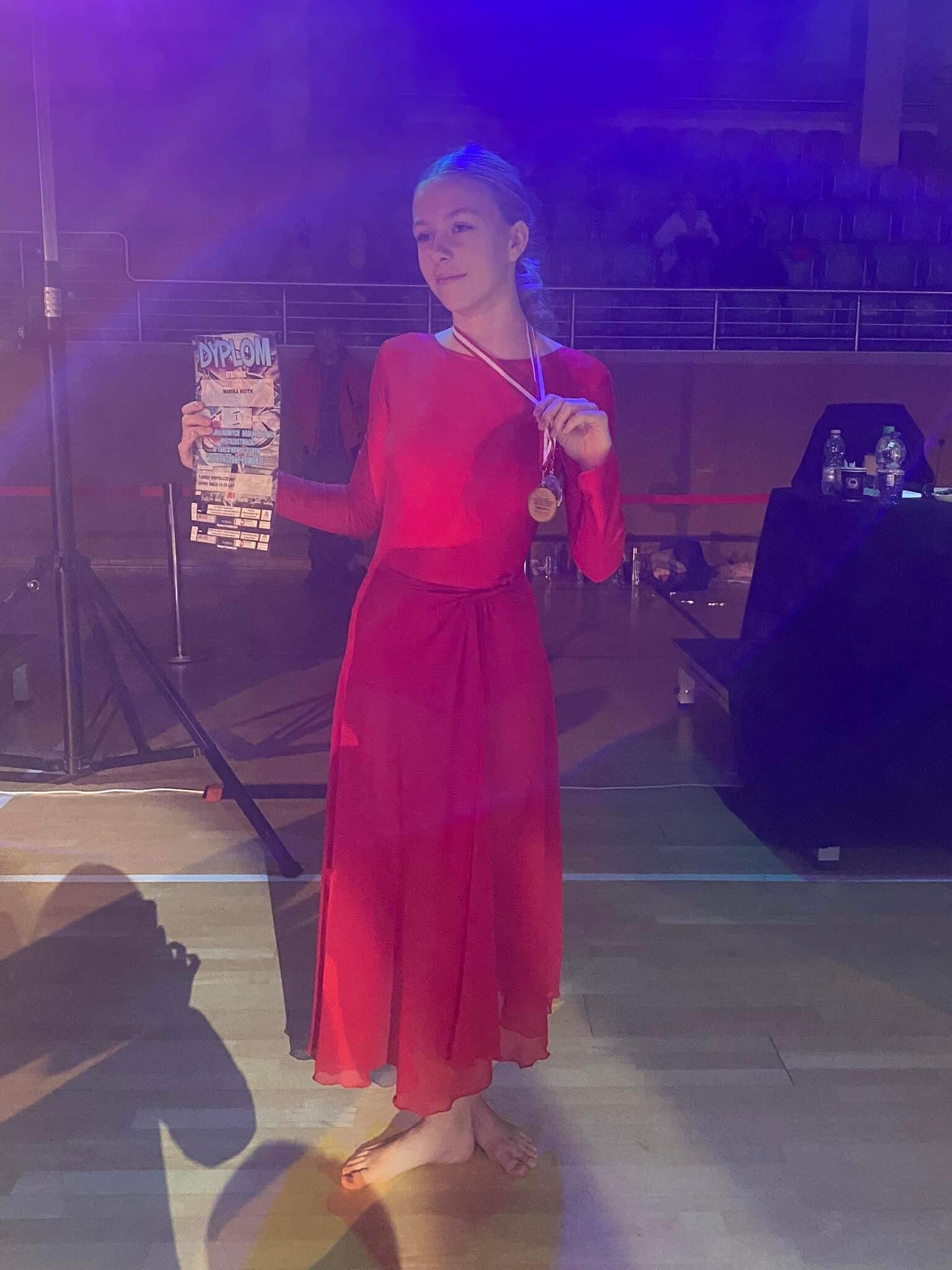 Jest nam niezmiernie miło poinformować, że uczennica klasy I b , Marika Miotk, w miniony weekend zdobyła dwa złote oraz jeden srebrny medal w IV Mikołajkowych Ogólnopolskich Mistrzostwach w Tańcu Nowoczesnym. Wspomniane wyróżnienia zostały wręczone w odpowiednich kategoriach tanecznych :  formacje - inne formy tańca, improwizacji tanecznej w tańcu współczesnym oraz występ solowy w kategorii inne formy tańca.