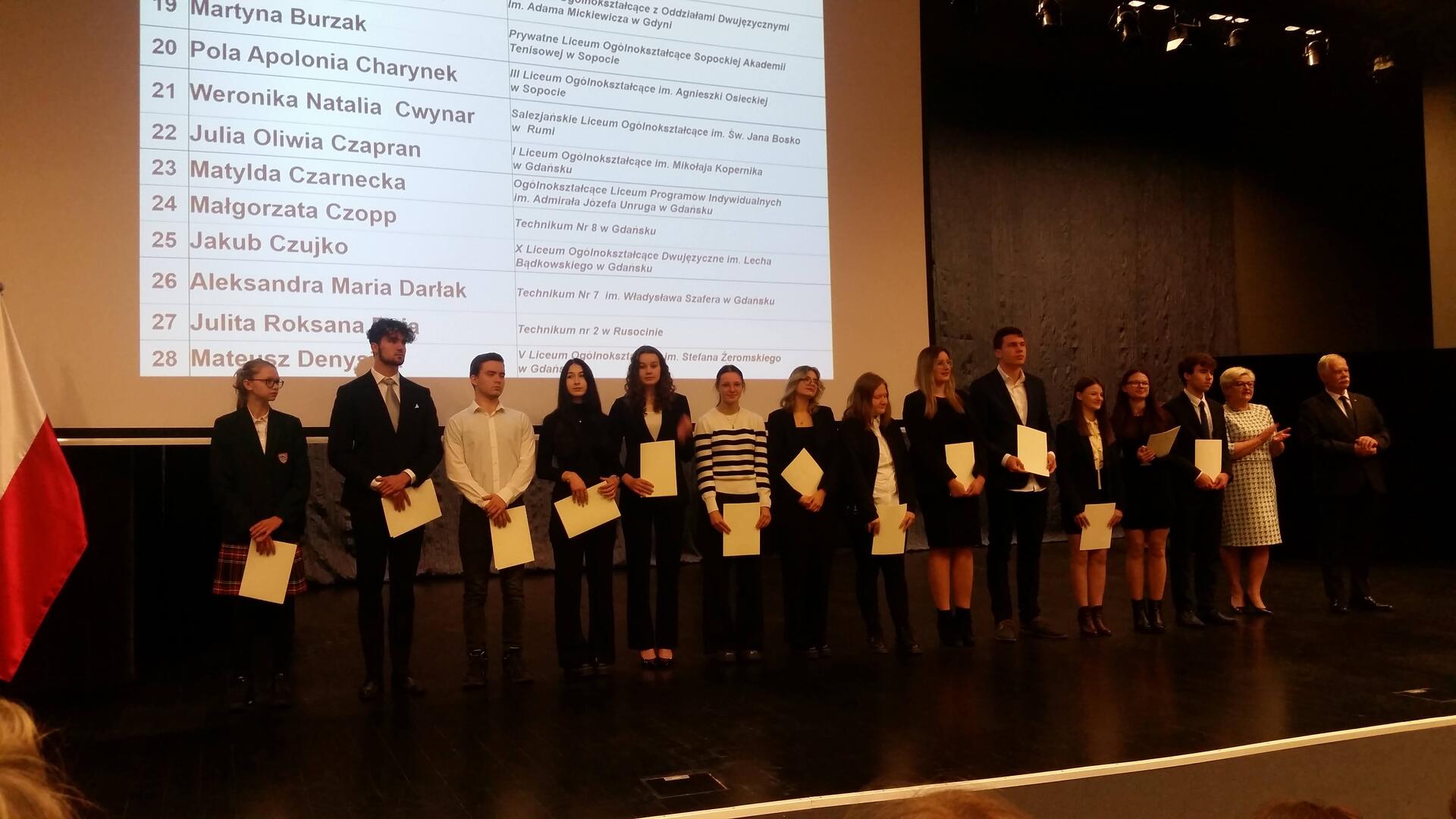 Pani Małgorzata Bielang - Pomorski Kurator Oświaty oraz Pan Mariusz Łuczyk -Wicewojewoda Pomorski wygłosili krótkie przemówienia, złożyli gratulacje a następnie wręczyli dyplomy nagrodzonym uczniom. Uroczystość została uświetniona występem zespołu tanecznego "Bursztynki" z ZSS nr1 w Gdańsku.