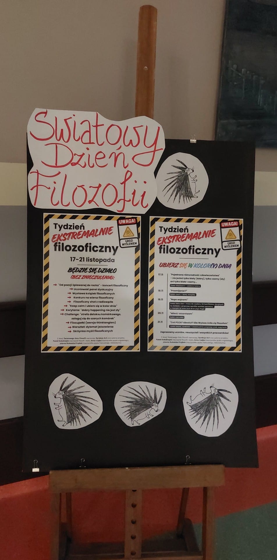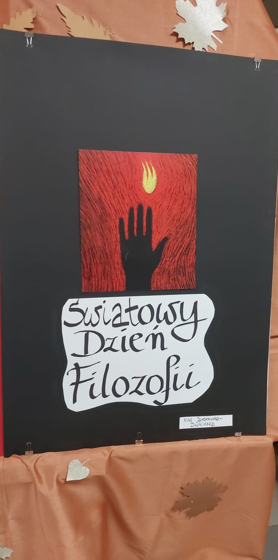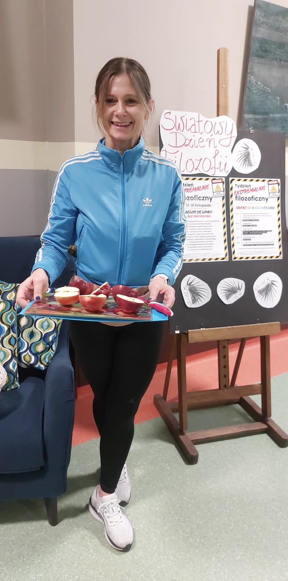 Światowy Dzień Filozofii obchodzony jest zawsze w przedostatni czwartek listopada, w naszej szkole mamy cały tydzień filozoficzny. Dziękujemy, że współtworzycie ten tydzień, manifestujecie kolorem, śpiewem, muzyką, myślą filozoficzną, happeningami, flagami, portretami filozofów, filosupełkami, dobrym słowem, a nawet "platońskim" jabłkiem. Zapraszamy jeszcze jutro.
