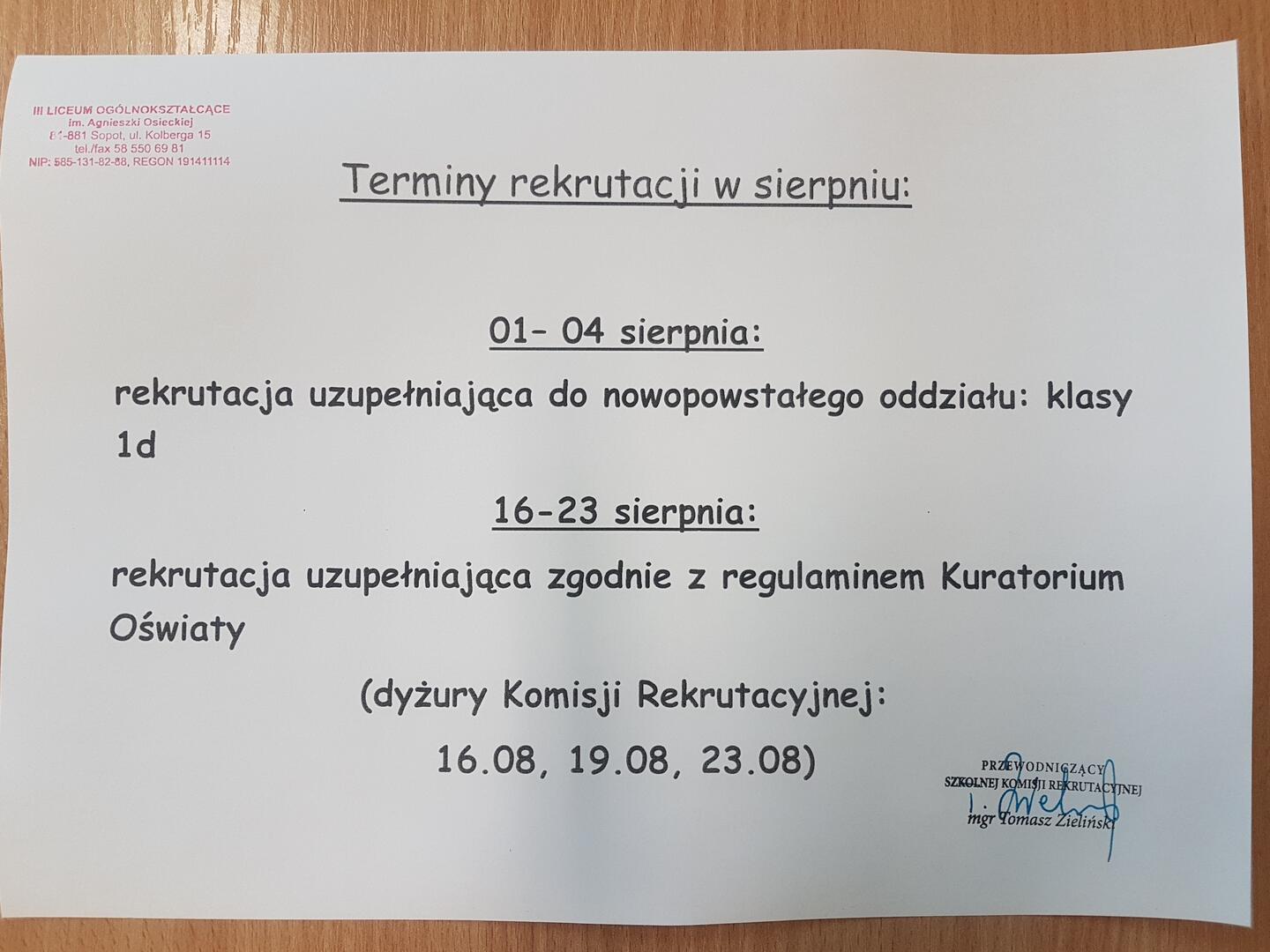 Proszę zapoznać się terminami rekrutacji w sierpniu.