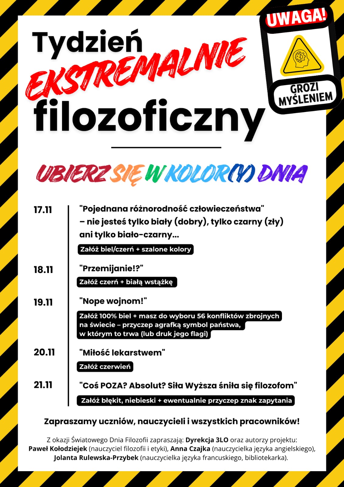Informacji część 2! Każdy uczeń, nauczyciel, pracownik administracji i obsługi może być jak bijące serce Tygodnia Filozofii. Zapraszamy WSZYSTKICH, aby każdego dnia (17-21.11) ubrać się w opisane na plakacie kolory.