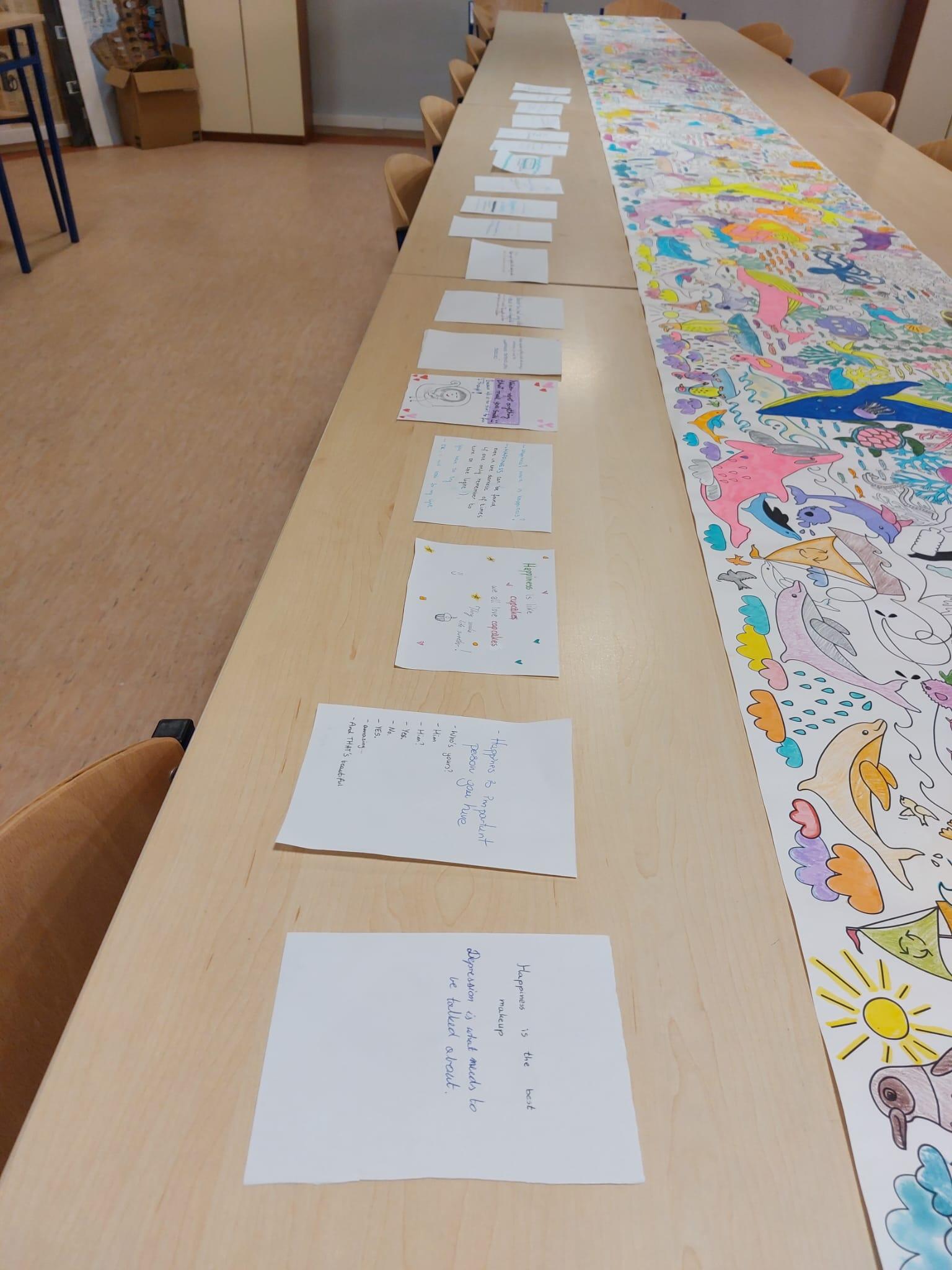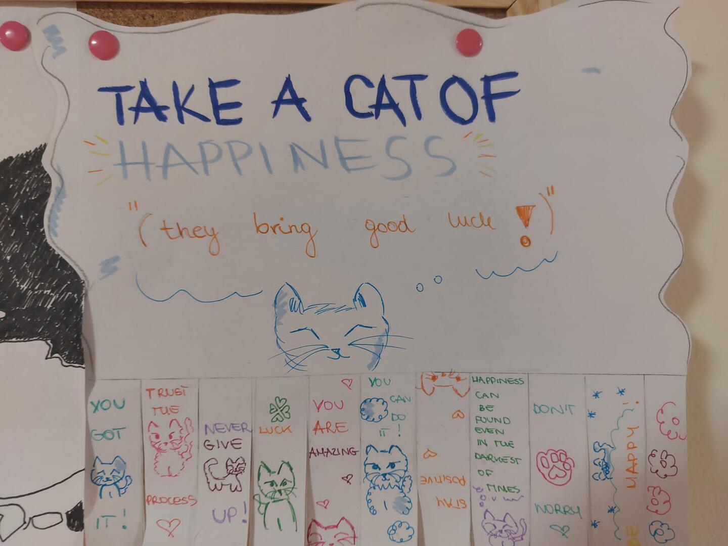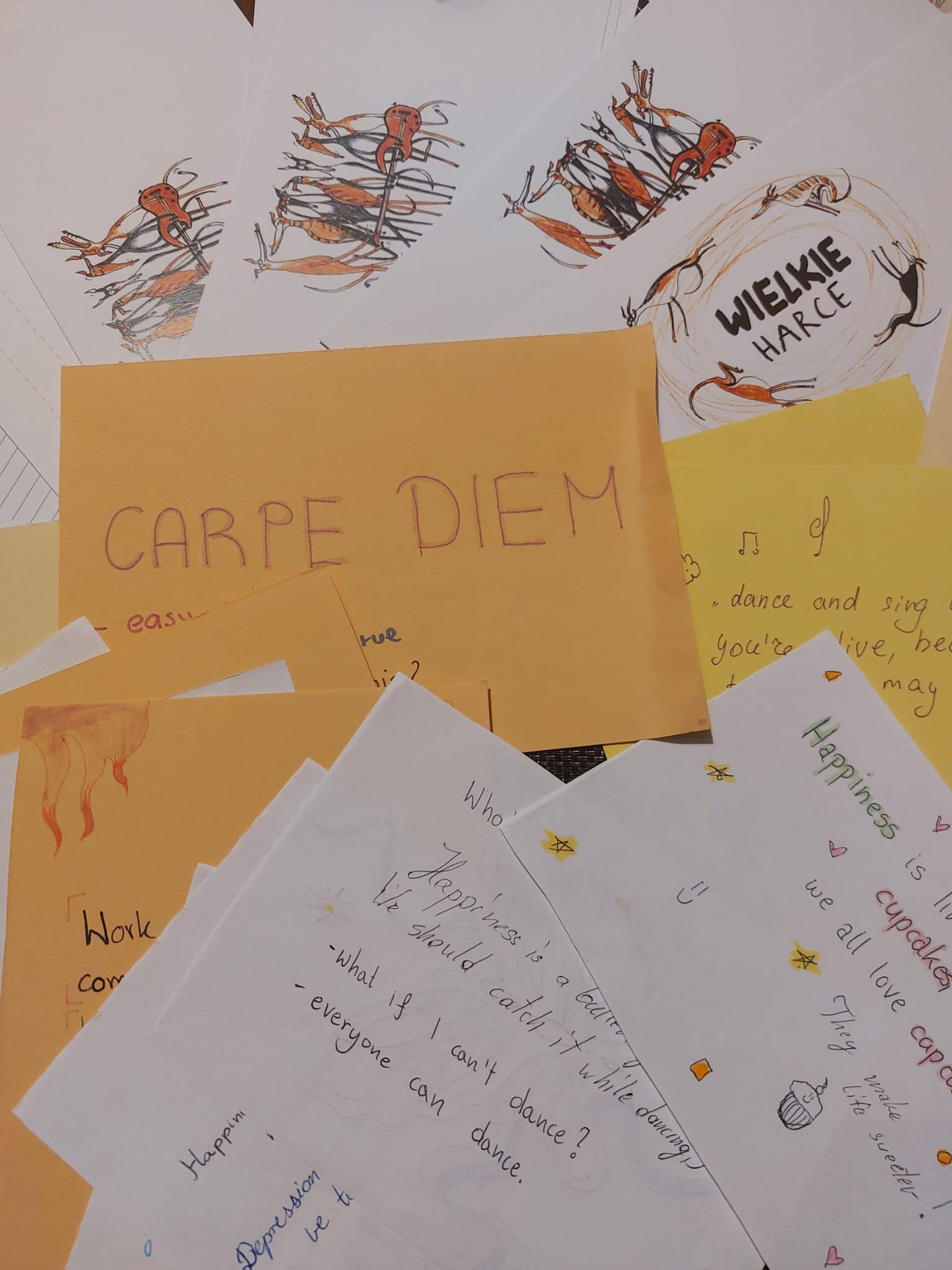 Tydzień szczęścia w szkole w naszym wydaniu wyglądał tak. Było dobrostanowo, inspirująco, kolorowo, słodko, kreatywnie, filozoficznie... Szczęście zapłonęło na przerwach, w salach lekcyjnych, pracowni filozoficznej, bibliotece, artystycznej bufeciarni, na trawniku i na ławkach. Rozpanoszyło się na dobre? a raczej mieszka tu od zawsze?