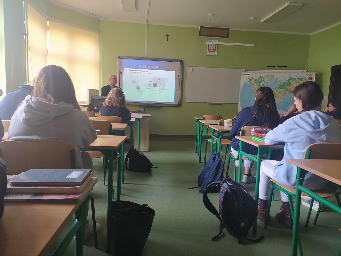 Pan Szymichowski w swoim półtoragodzinnym wykładzie zaprezentował m.in. miejsca wydobycia ropy naftowej, sposoby ich wydobycia, głównych światowych producentów i konsumentów, zastosowanie ropy naftowej.