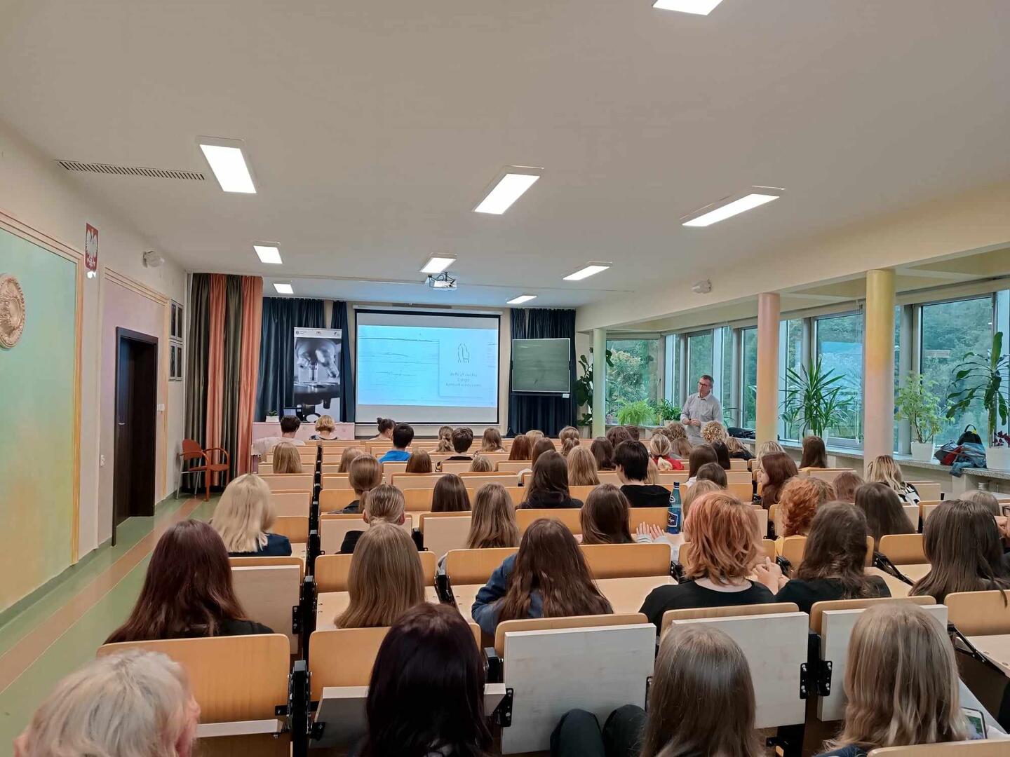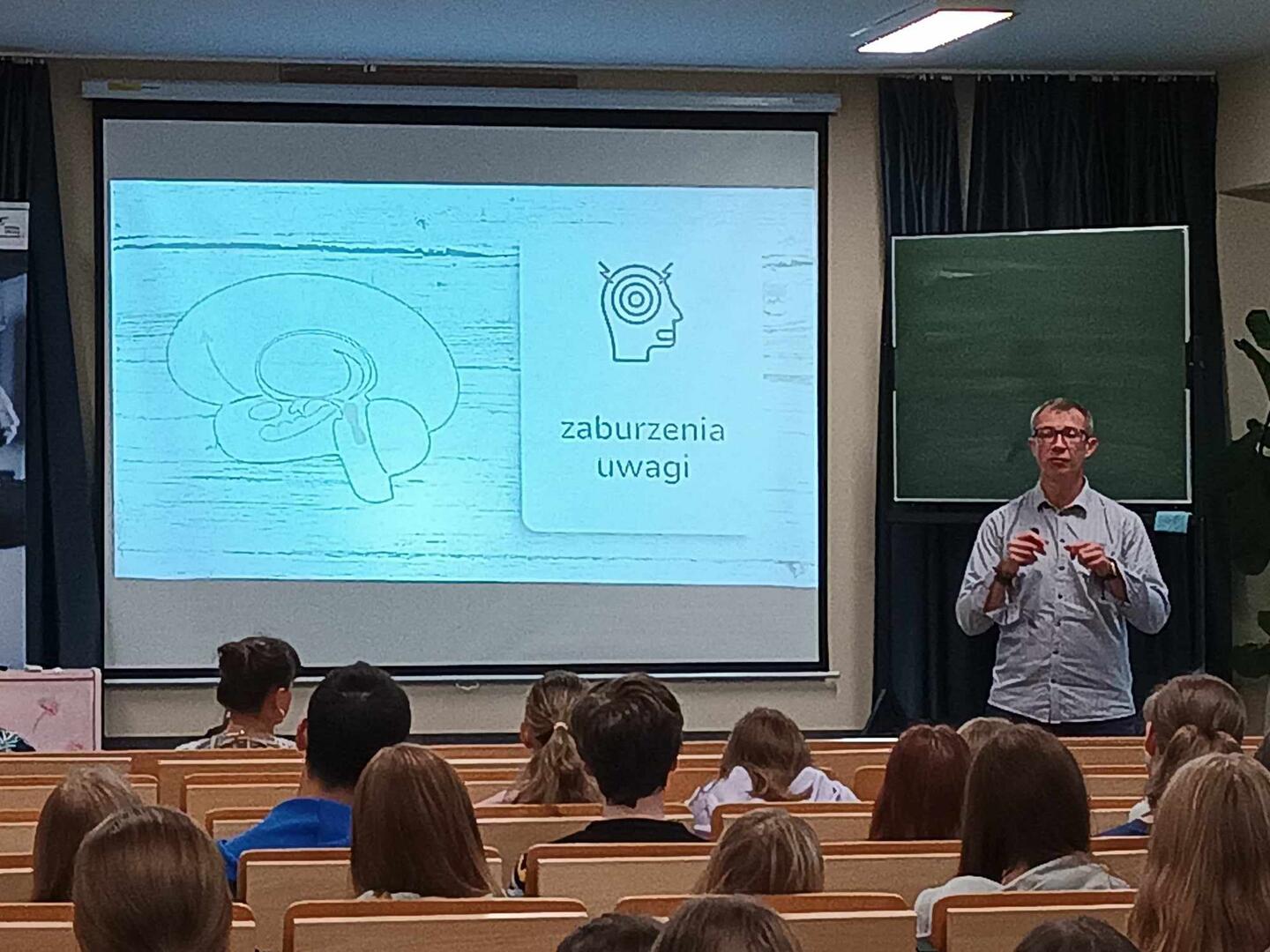 Dzisiaj na auli naszej szkoły odbył się wykład pt. Mózg online - nowe technologie a mózg, w którym uczestniczyli uczniowie z klas z rozszerzoną biologią. O działaniu mózgu opowiedział nam dr Wojciech Glac z Wydziału Biologii UG w ramach programu Zaproś naukowca do szkoły.