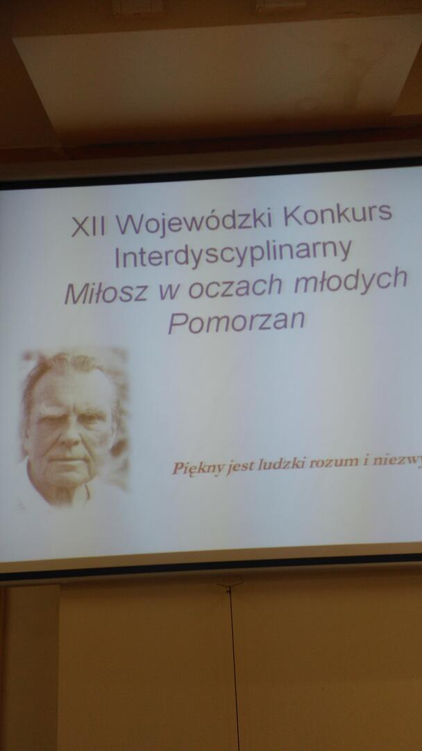 To już XII edycja konkursu Miłosz w oczach młodych Pomorzan. Naszą szkołę reprezentowała w tym roku Monika z klasy trzeciej i została nagrodzona wyróżnieniem. Gratulacje! Uwierzcie, że konkurencja była silna. Teraz trzymajmy kciuki za autorów prac literackich i plastycznych. Rozstrzygnięcie wkrótce.